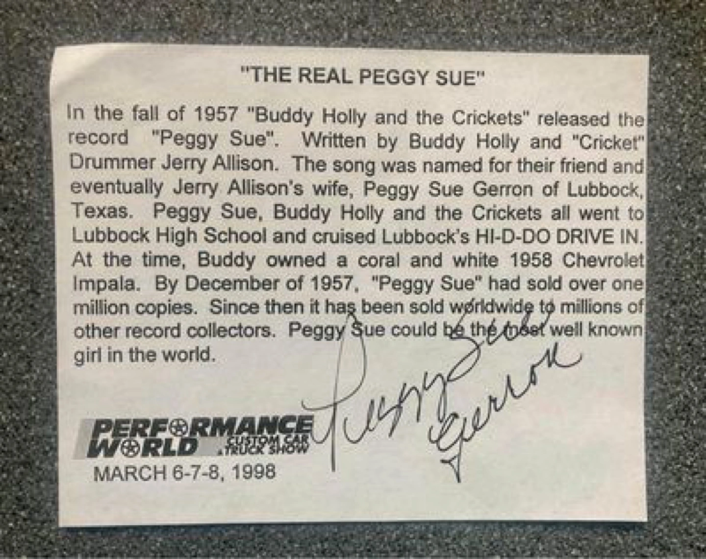 Autograph signed by Peggy Sue Gerron, the real Peggy Sue.