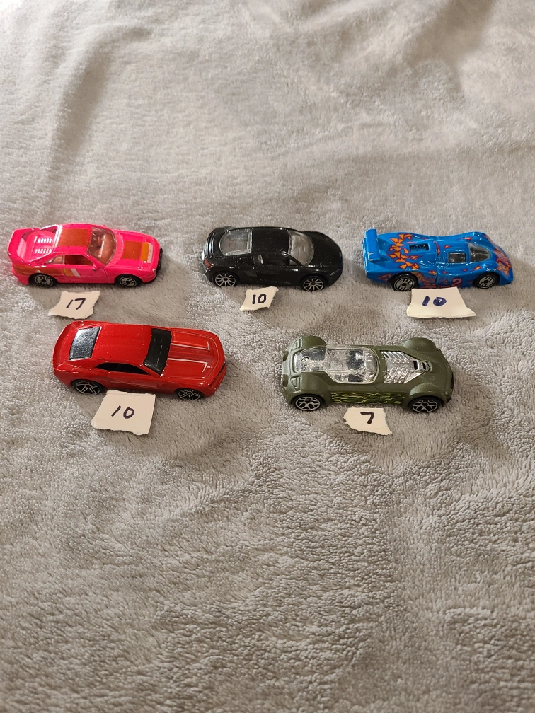 Set of 5 Hot Wheels die-cast cars. Includes a red car, a black car, a pink car, a blue car, and a green car. Prices listed are negotiable.