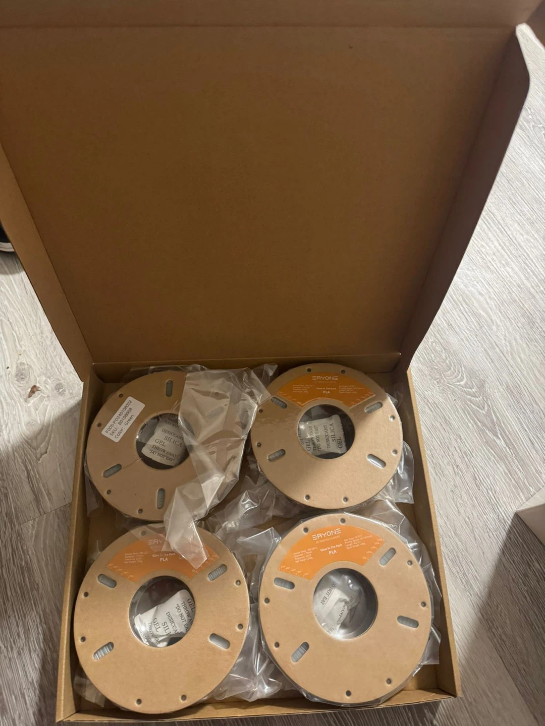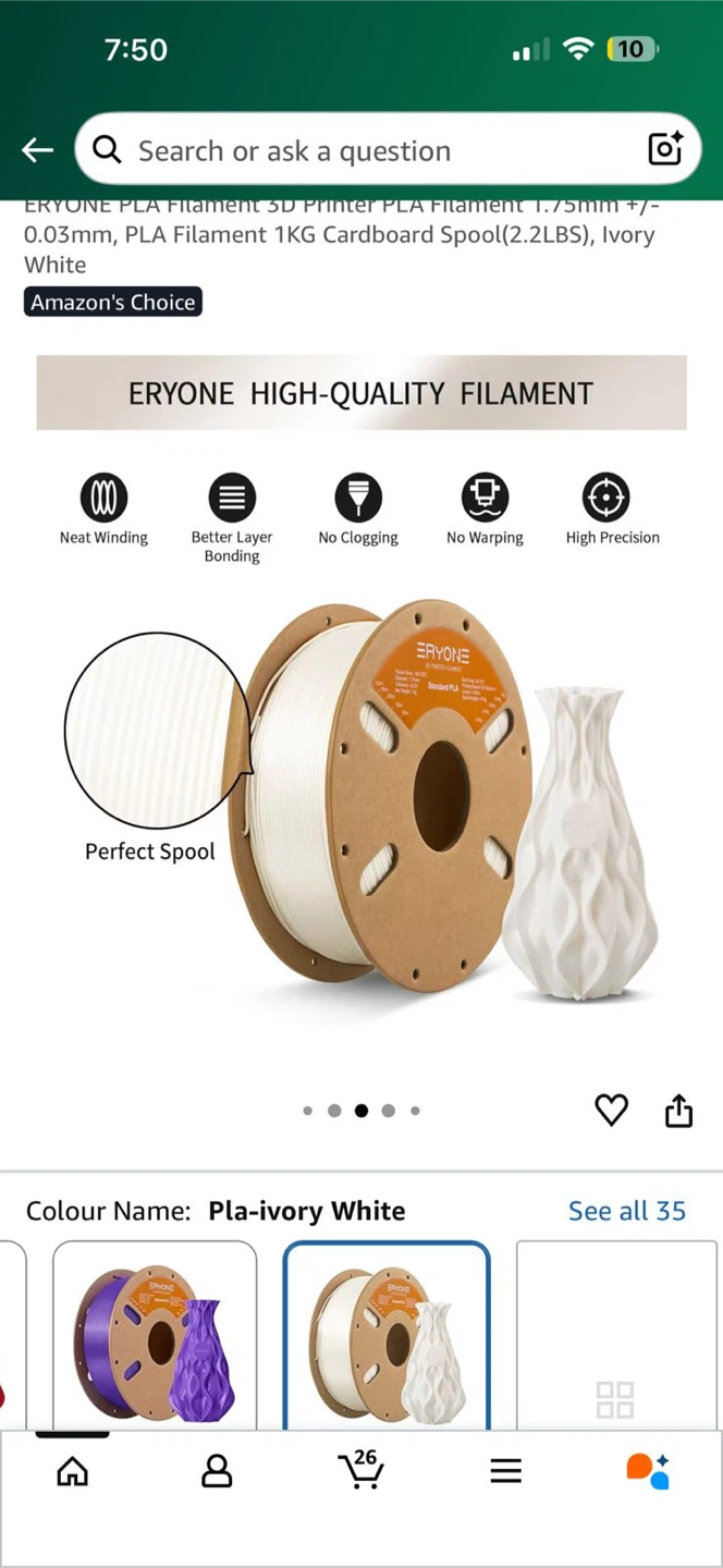 I'm selling ERYONE high-quality PLA filament in ivory white. It's 1.75mm and comes on a cardboard spool. The filament features neat winding, better layer bonding, no clogging, no warping, and high precision. Perfect for your 3D printing needs!