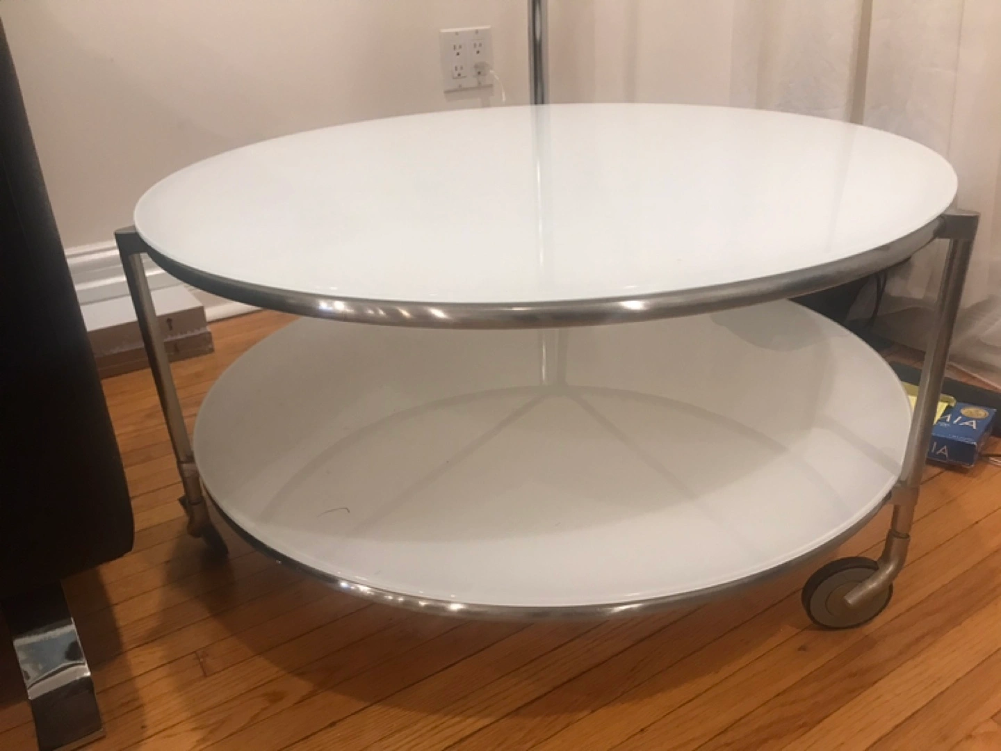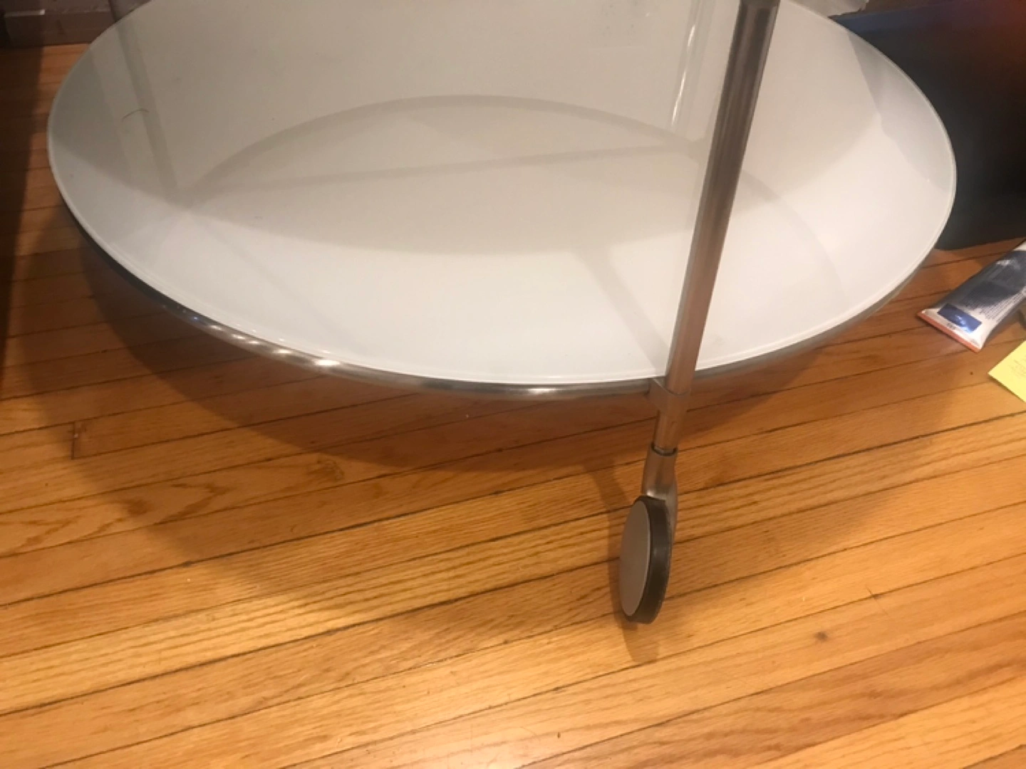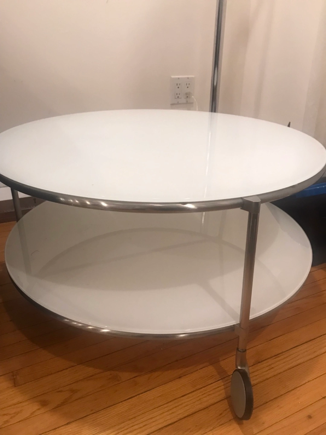 Round glass-top coffee table with a lower shelf. Metal frame with wheels. White glass top. In good condition. Pick up only!