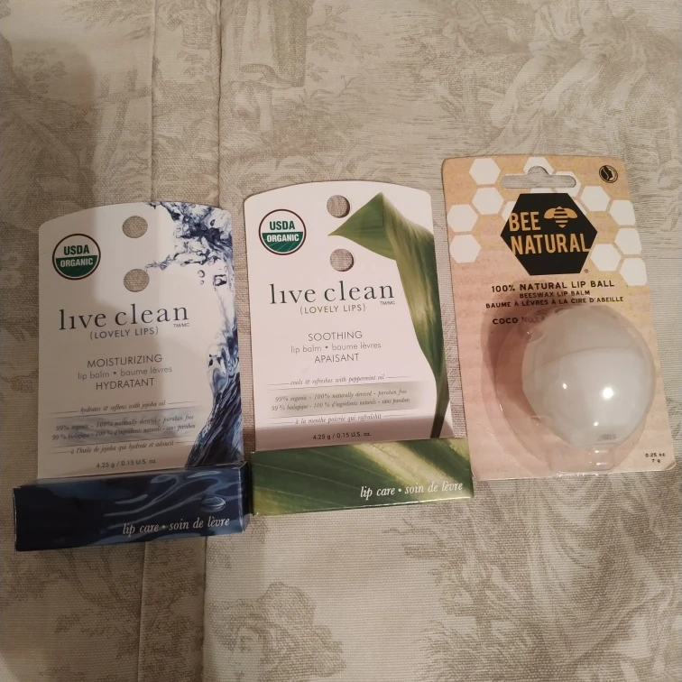 1000+Live Clean lip balm. Soothes and refreshes with peppermint oil. 99% organic. 100% naturally derived. Paraben free. 99% fragrance free. 100% ingredients extracted. 4.25g / 0.15 US oz. 3 lip balms. all 3 for $6