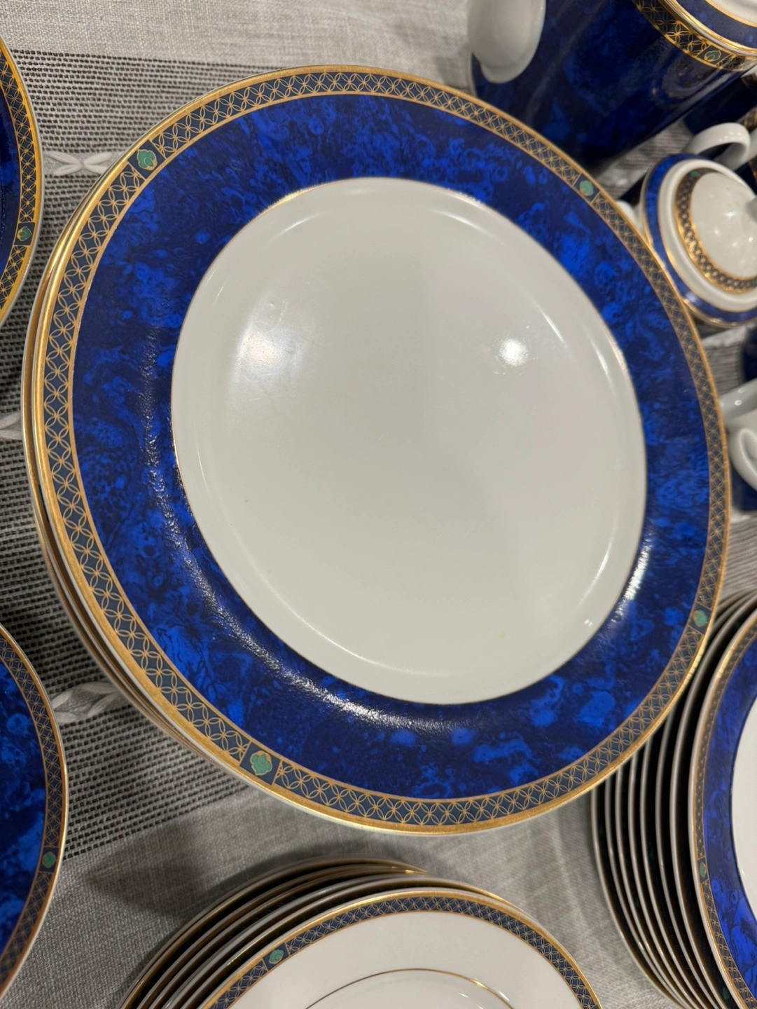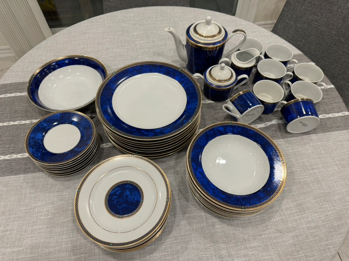 Dinnerware set with blue and gold accents. Fine China. In excellent condition-Never used. Includes 8 dinner plates, 8 salad plates, 8 bowls, 8 cups, 8 saucers, teapot, creamer, sugar bowl and large service bowl.