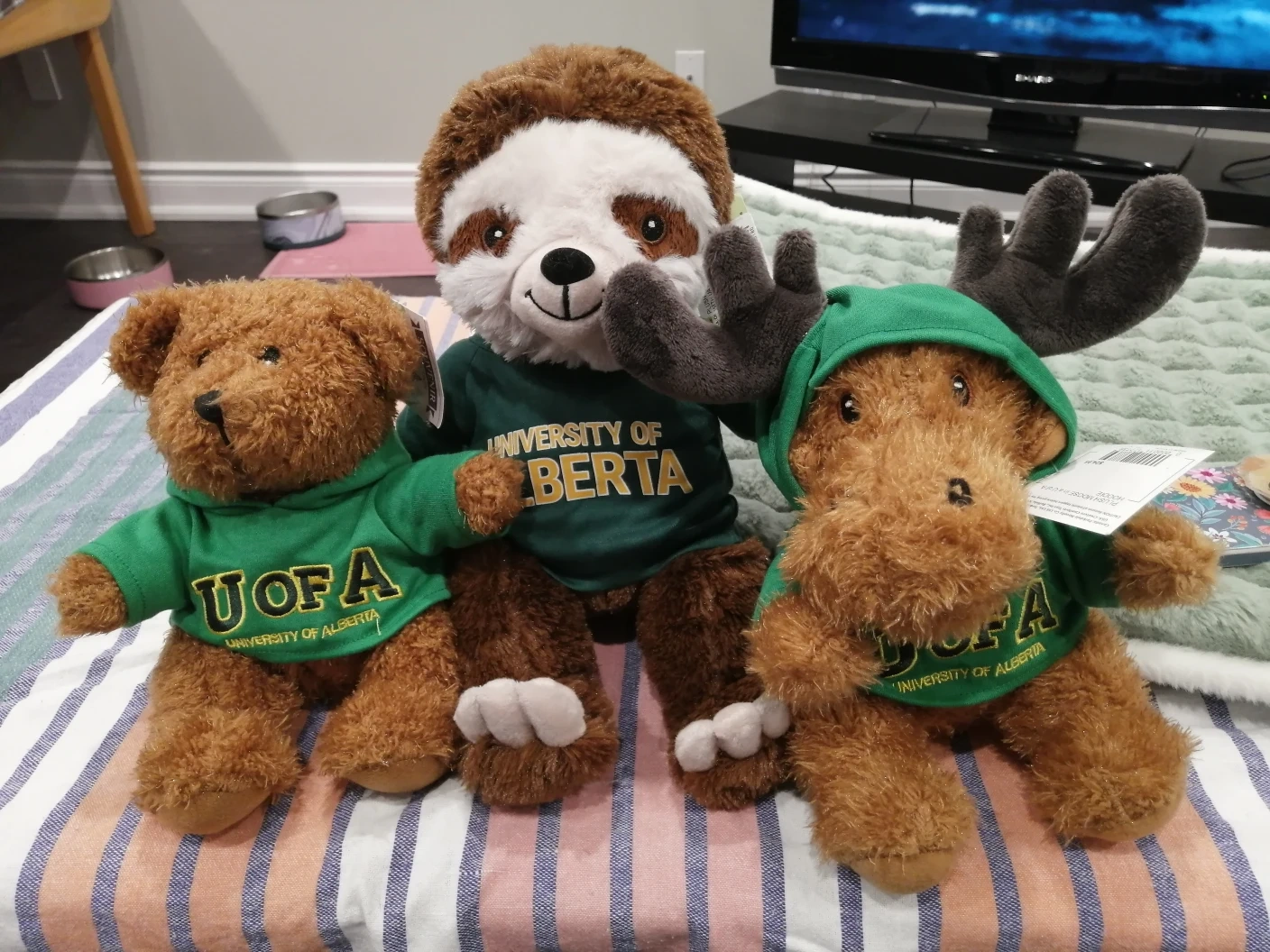 Plushs wearing a green University of Alberta hoodie. They're all new with tags on. $12 each one or take the 3 for $30.