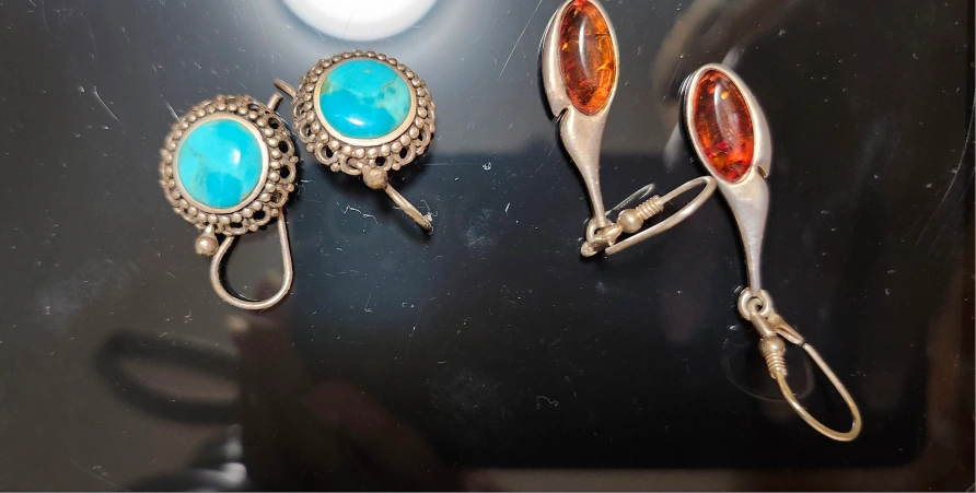 Set of 2 vintage earrings with turquoise and amber stones. Sterling Silver.