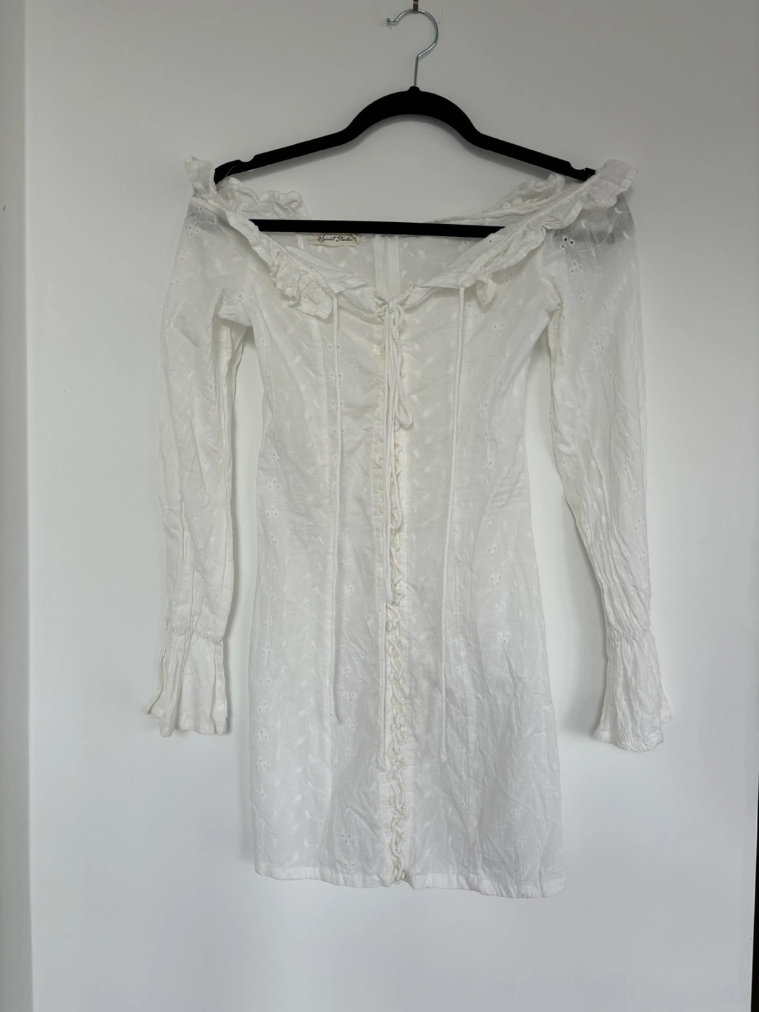 White off-the-shoulder dress with long sleeves and a lace-up front. Features delicate floral embroidery and ruffles.