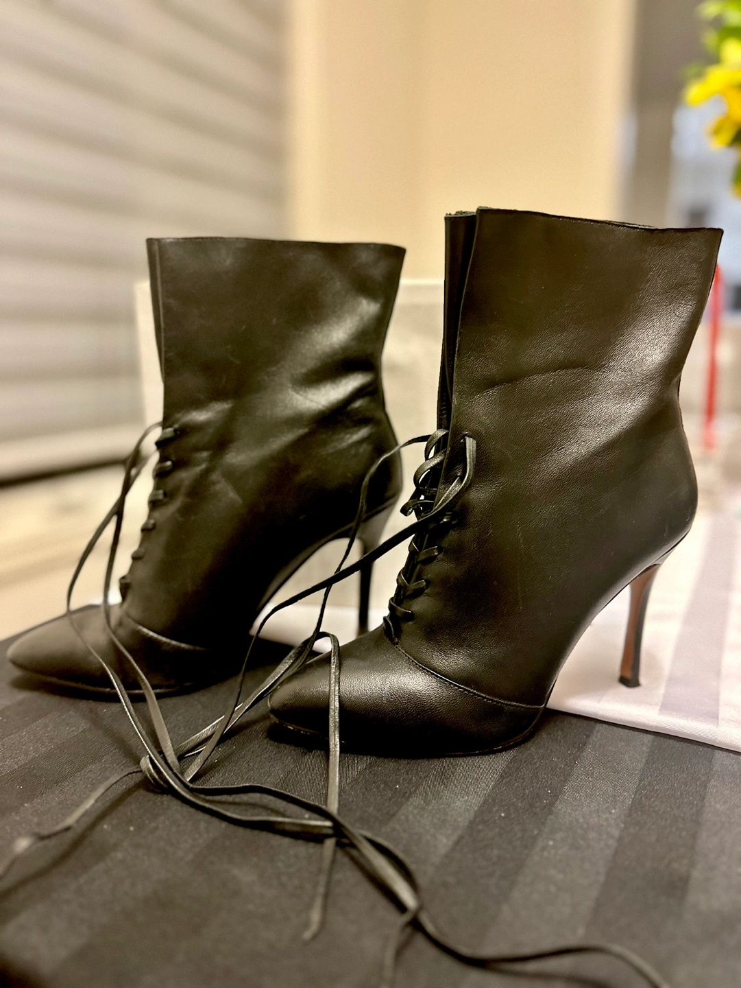 Black leather booties with a high heel and lace-up closure. The boots are in good condition. Size 7.