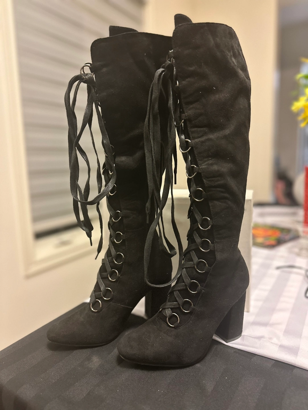 Black suede knee high boots with lace up detail and chunky heel. Size 7. Barely used