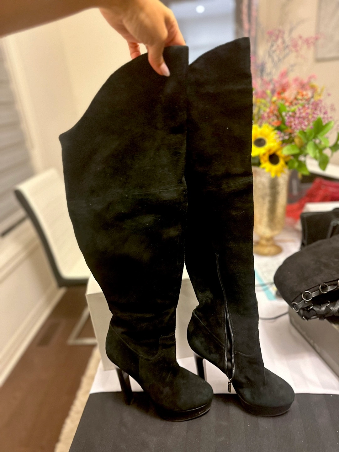 Buy & SellBlack Suede Over the Knee BootsBlack Suede Over the Knee Boots$25Black suede over the knee boots with a high heel and platform. Zip closure on the side.ConditionGoodSize7BrandElmonteWHERE TO MEETAuroraView MapSELLERMadinaAurora Centre N100 reviews0 chats·0 favorites·12 views