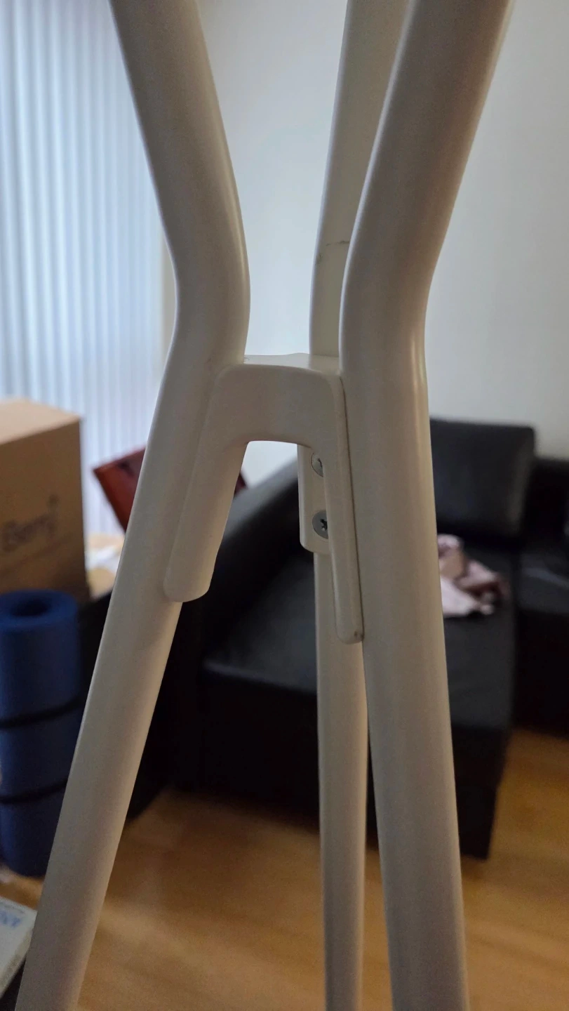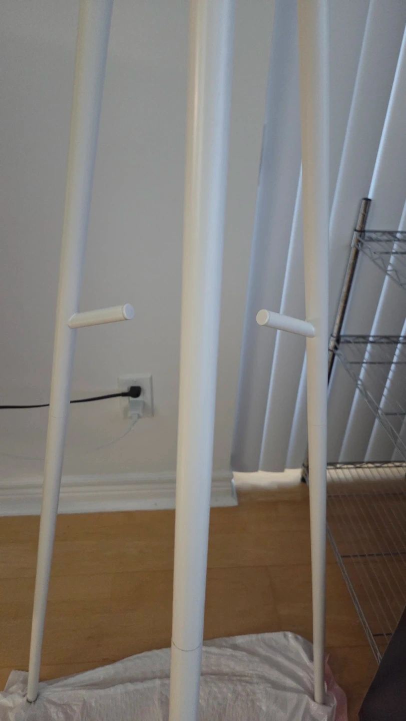 This is a white coat rack. It's made of metal and has a tripod base. It stands about 5.5 feet tall with multiple hooks for coats and accessories. It's a practical addition to any entryway or bedroom!
