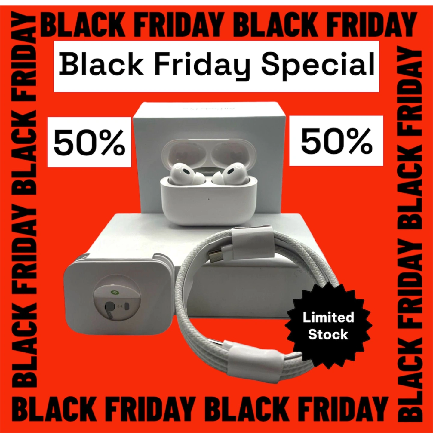 White AirPods Pro with charging case and a lightning cable. Limited stock.