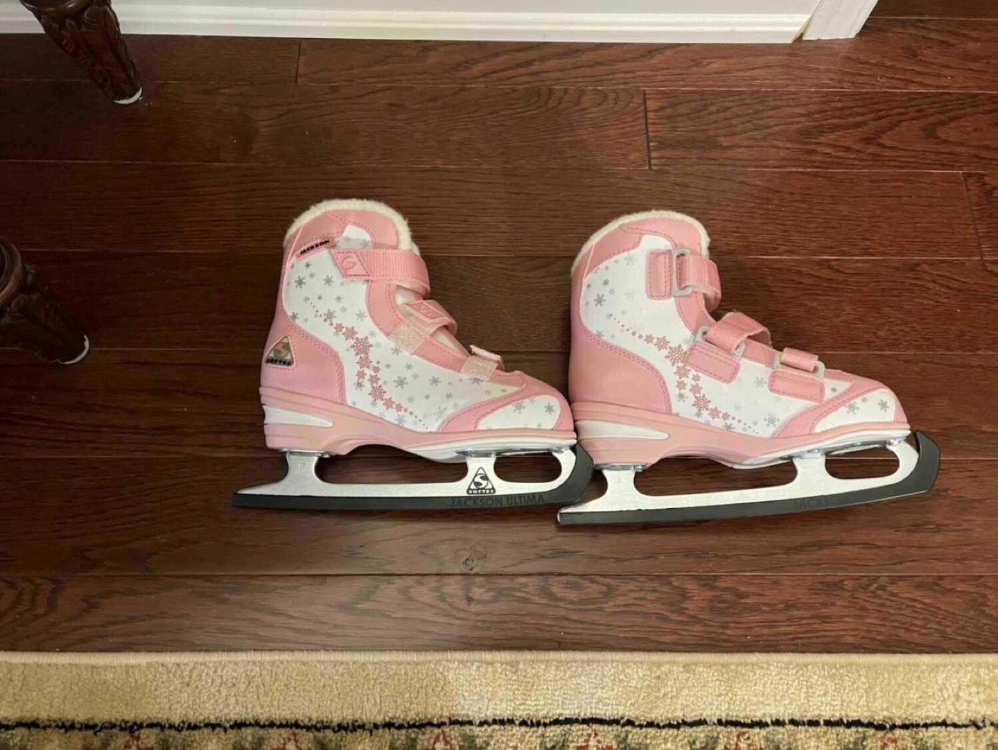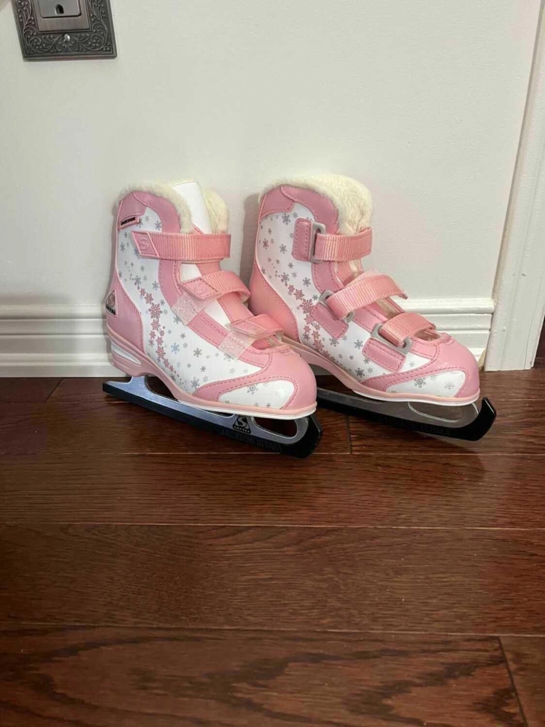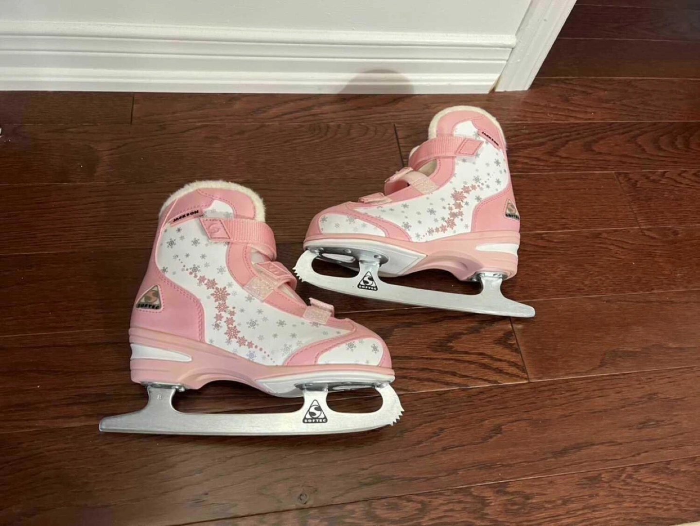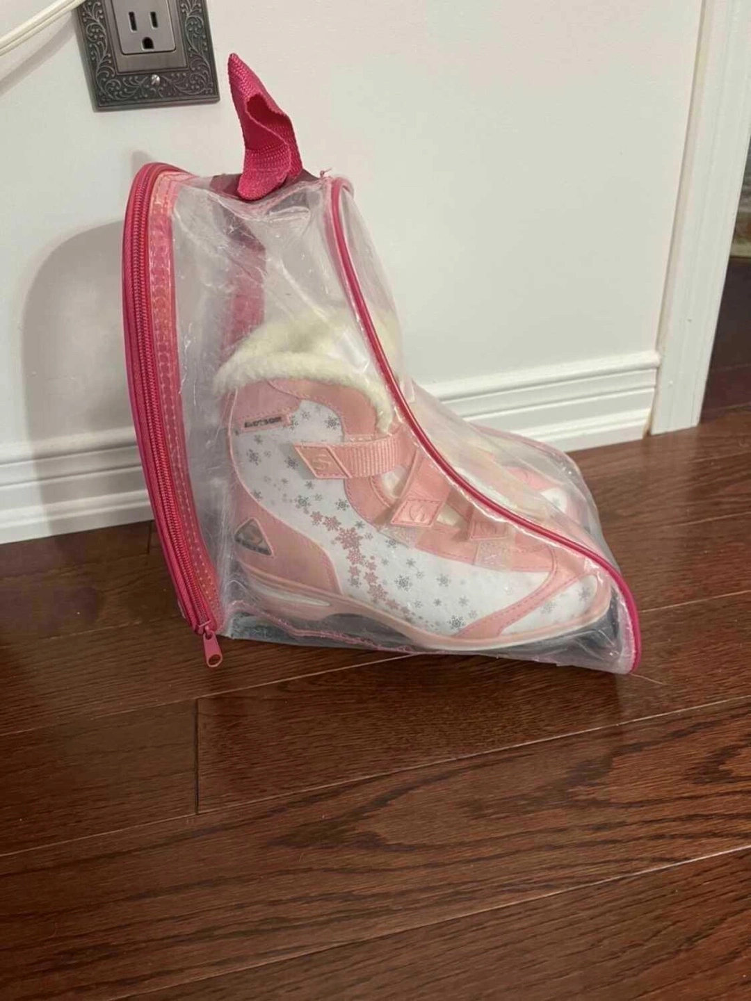 218Pink and white figure skates with a snowflake pattern. Includes a carrying case. BNIP, Softec brand Youth size 2 (for age 9+) Brand new, never used, from Sportchek Taken out of package only to take photos Softec brand, velcro straps for closure Come with blade guards and a bag (shown on one of the photos) Would make a perfect gift. From a smoke /pet free home PPU North Oshawa-Windfields