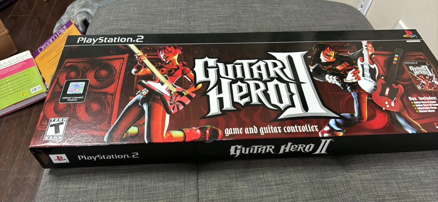 Guitar Hero II game and controller for Playstation 2. Includes game, guitar controller, and all original packaging. Includes all original stickers.