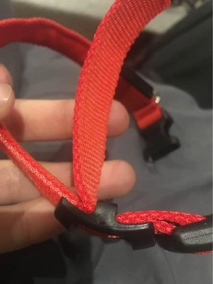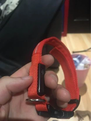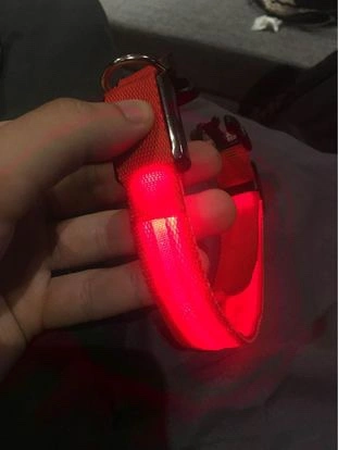 Red LED dog collar with adjustable buckle. Lights up when switched on.