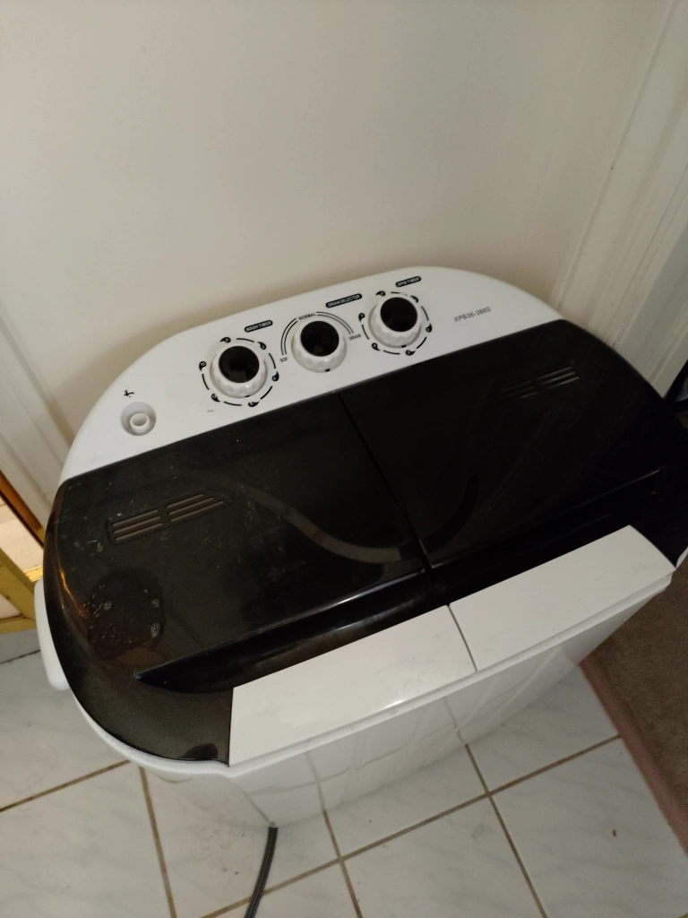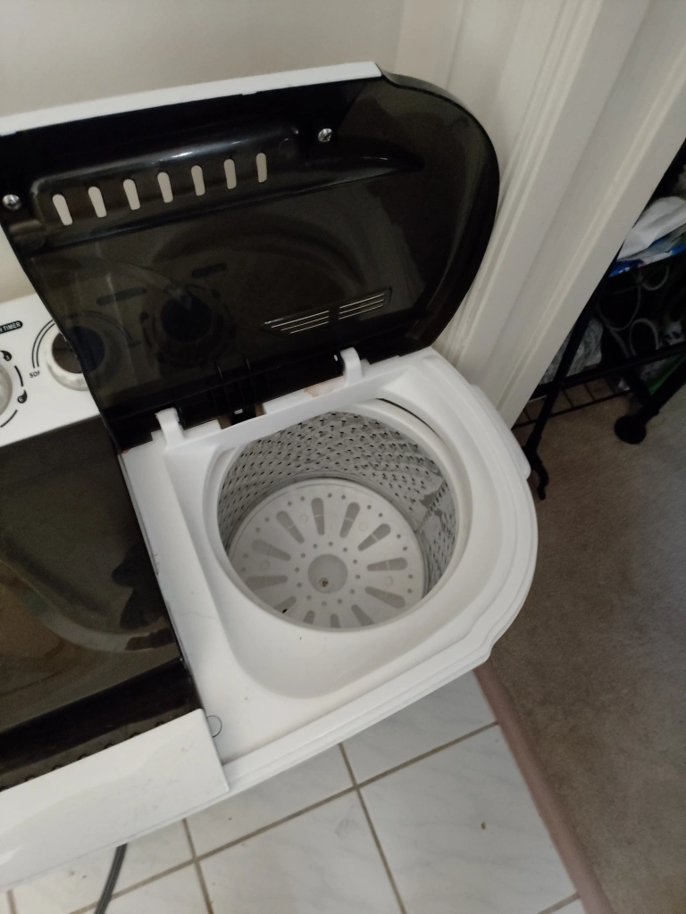 Needs a water inlet hose. Lost during moving. You can use a regular hose. Both washer and spin work well. Clean inside and out.