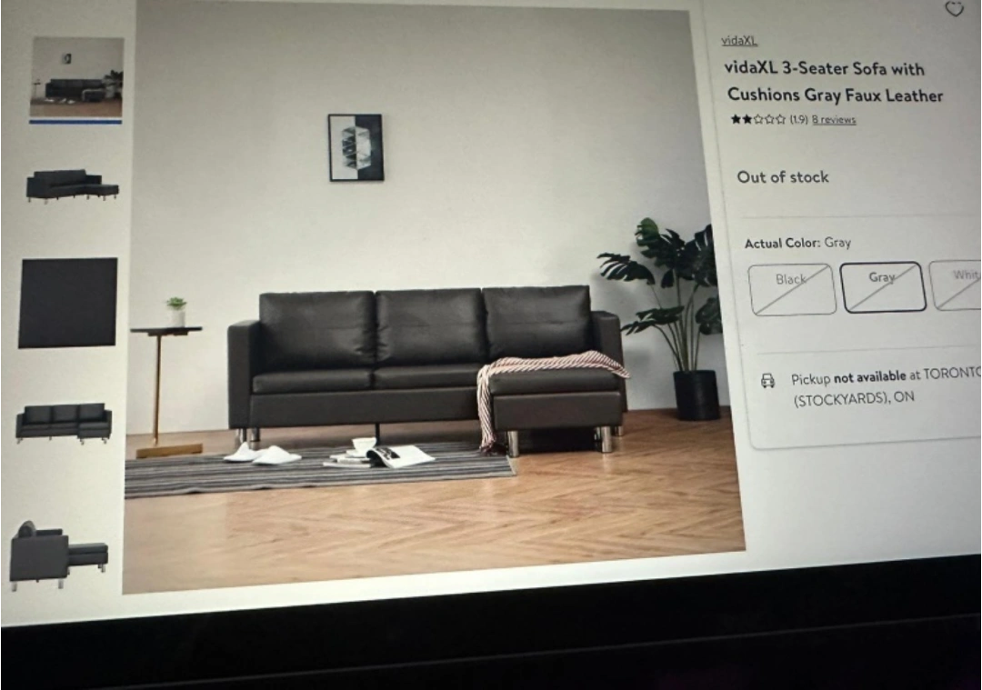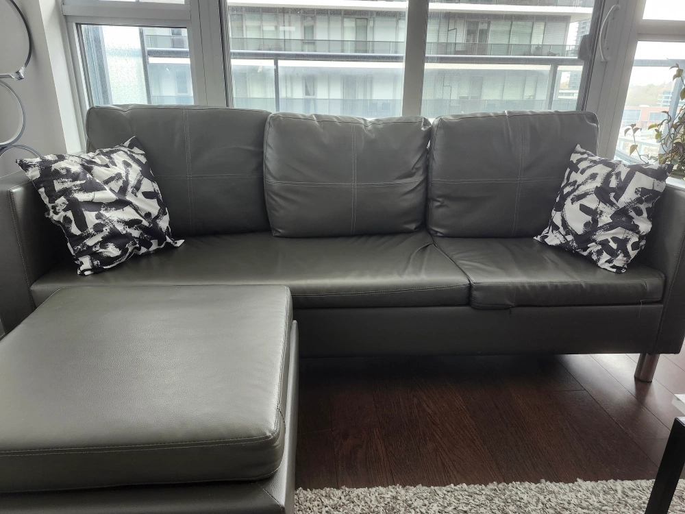 Grey leather sectional sofa with ottoman. Great condition. Comes with three pillows. No pet. No smoke.