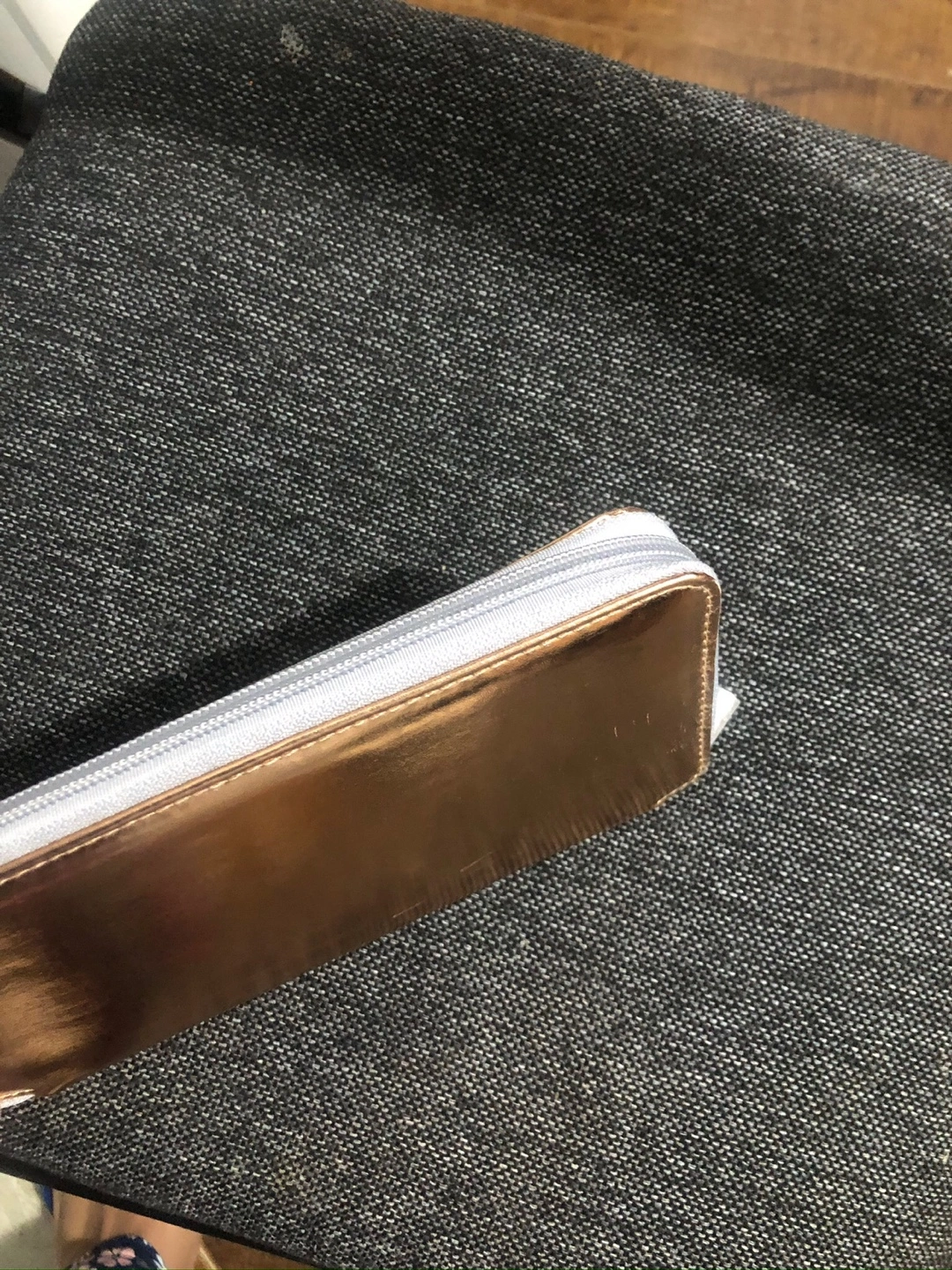 Rose gold coloured clutch with zipper closure. Contains multiple interior pockets.