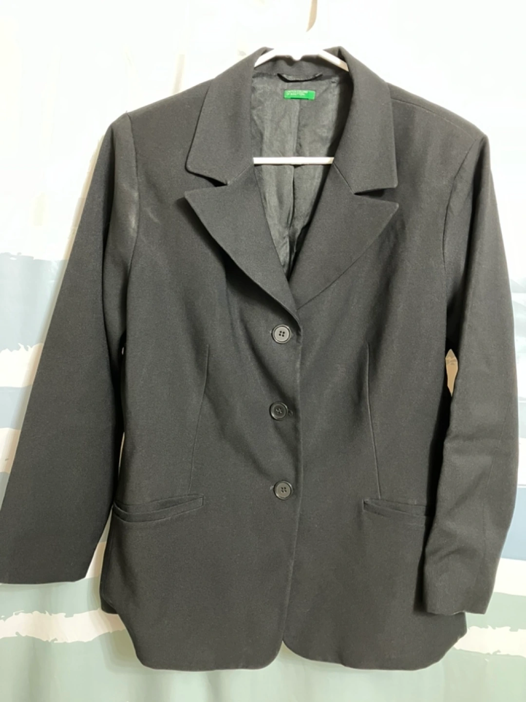Black blazer jacket with long sleeves, three buttons, and two pockets.
