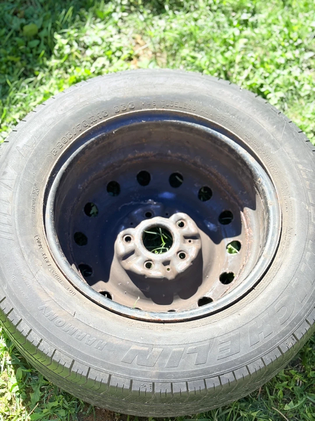 Selling a used Michelin Harmony tire, size P205/70R15, mounted on a steel rim. It's a tubeless all-season tire marked M+S. Good for anyone needing a spare or replacement!