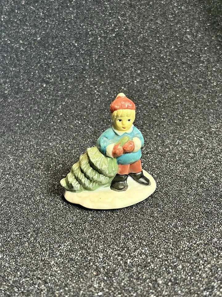 Vintage Christmas village figurine of a boy carrying a tree in great condition.
