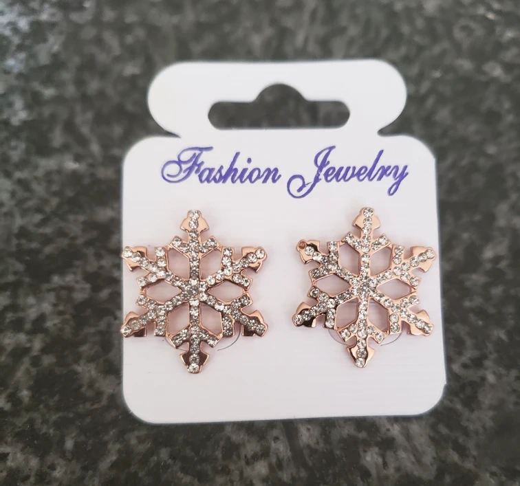Rose gold snowflake earrings with clear crystal embellishments.