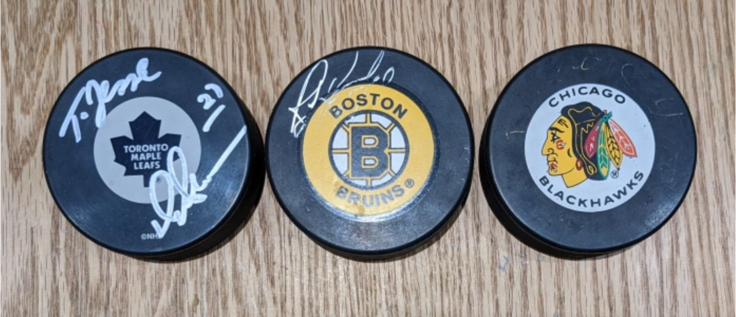 751Autographed NHL Hockey Pucks (x3) Toronto Maple Leafs - Tie Domi. Boston Bruins - Unknown. Chicago Blackhawks - Unknown (#9)