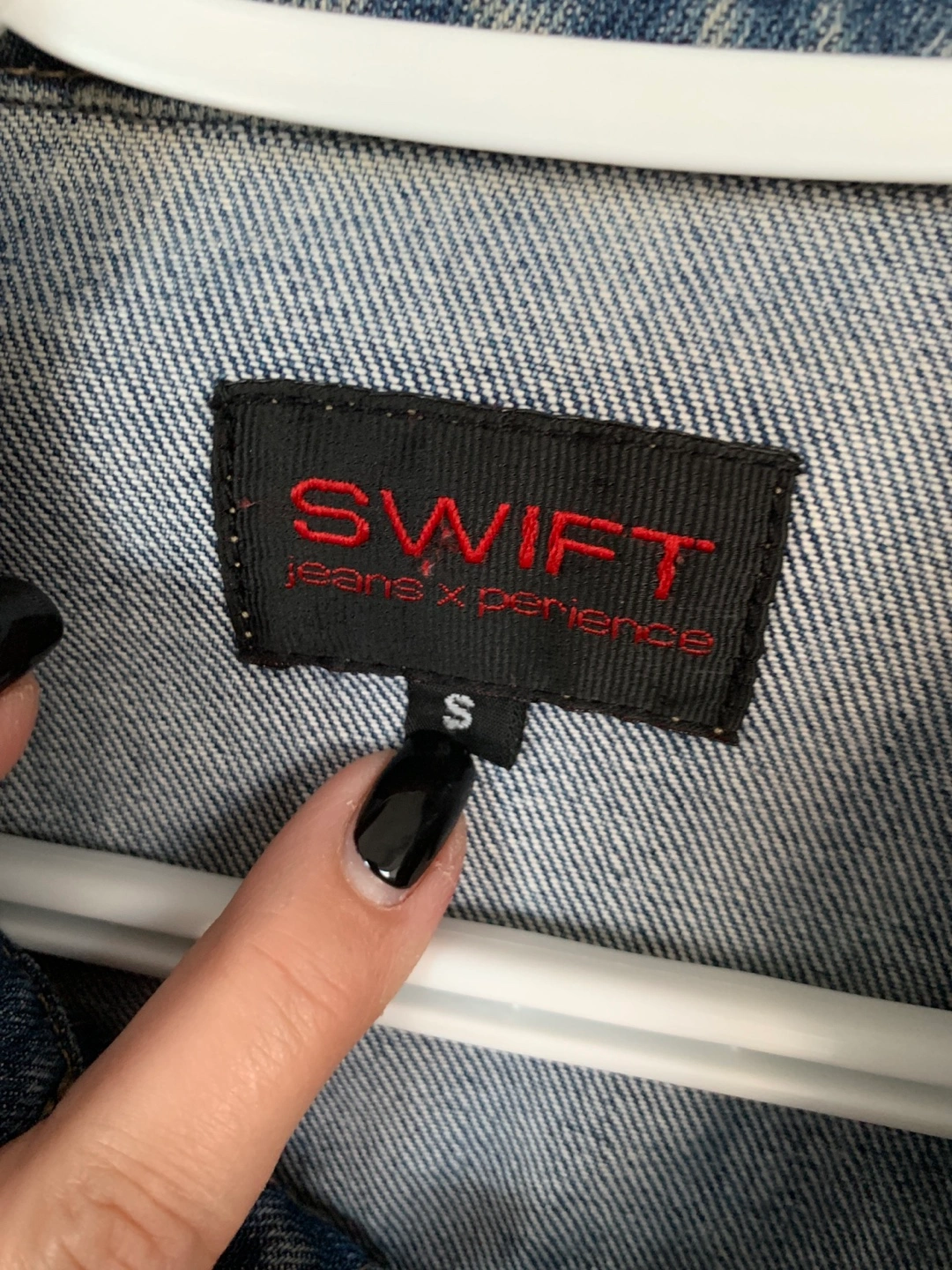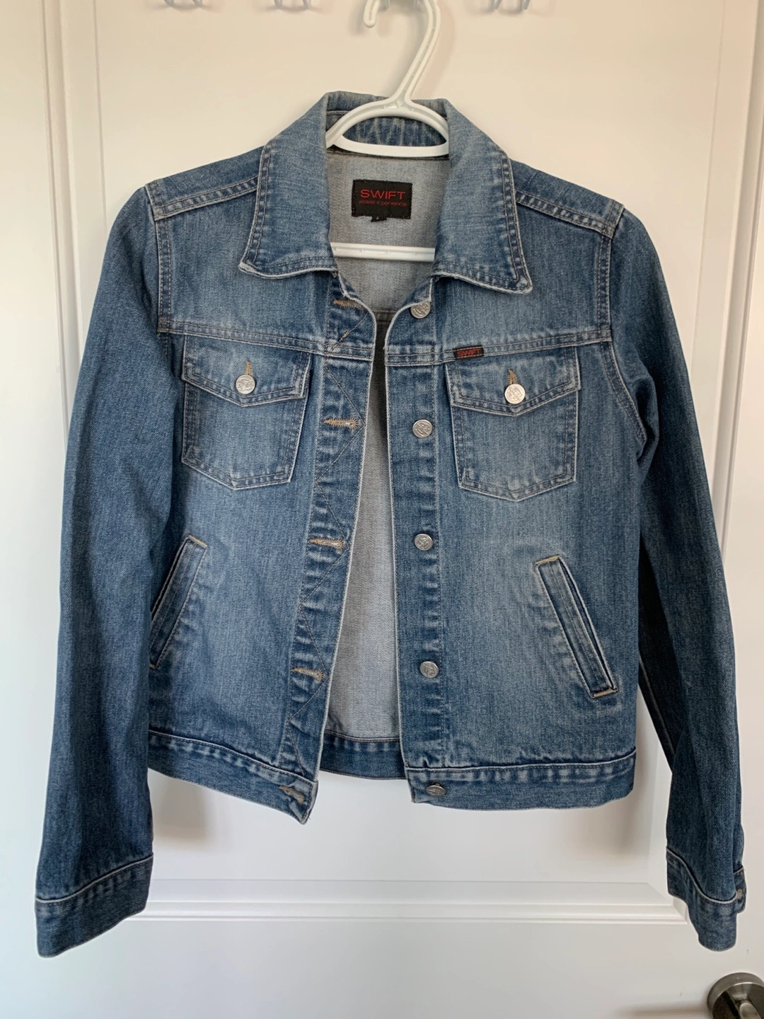 Size small, blue denim jacket.