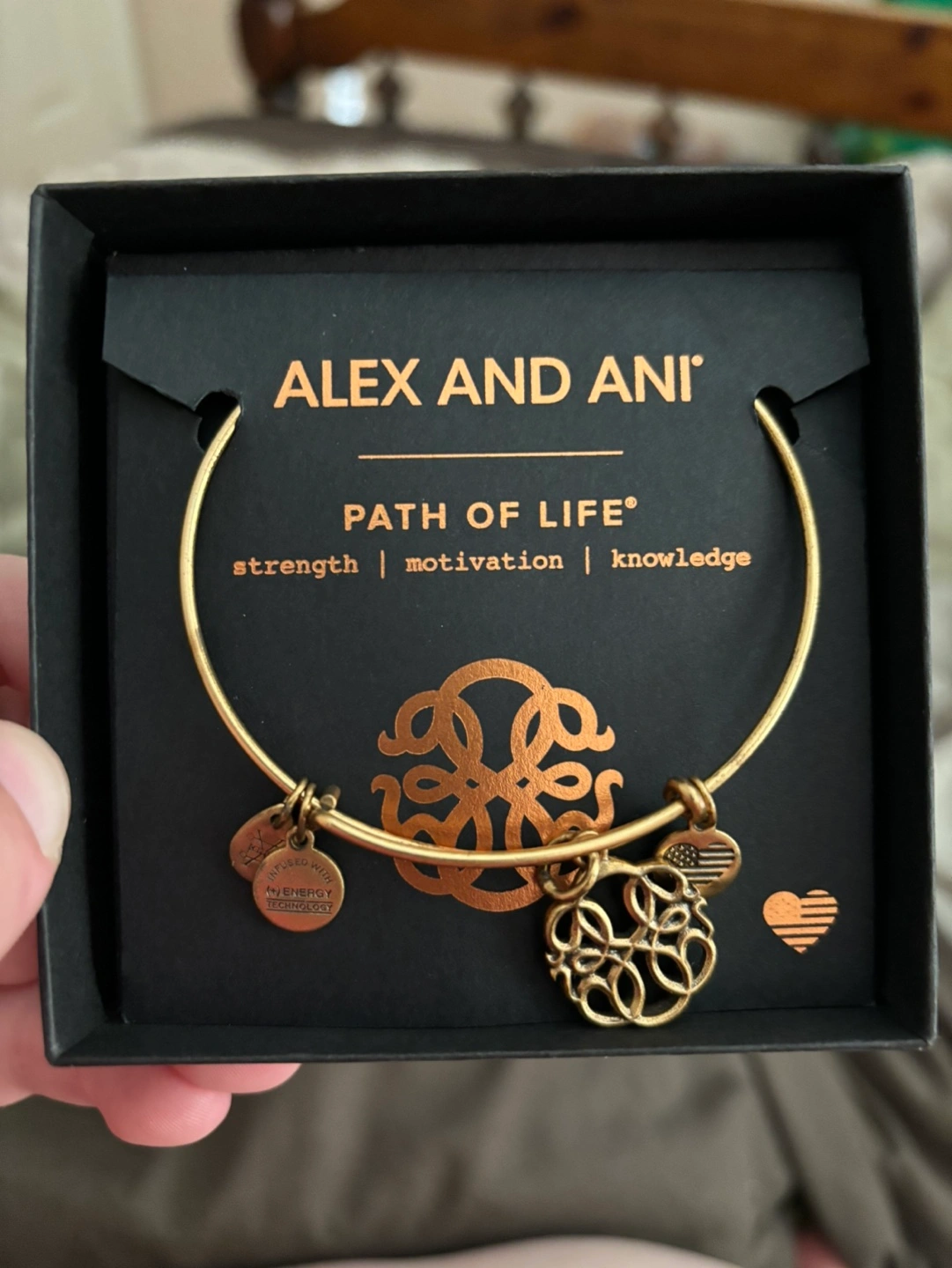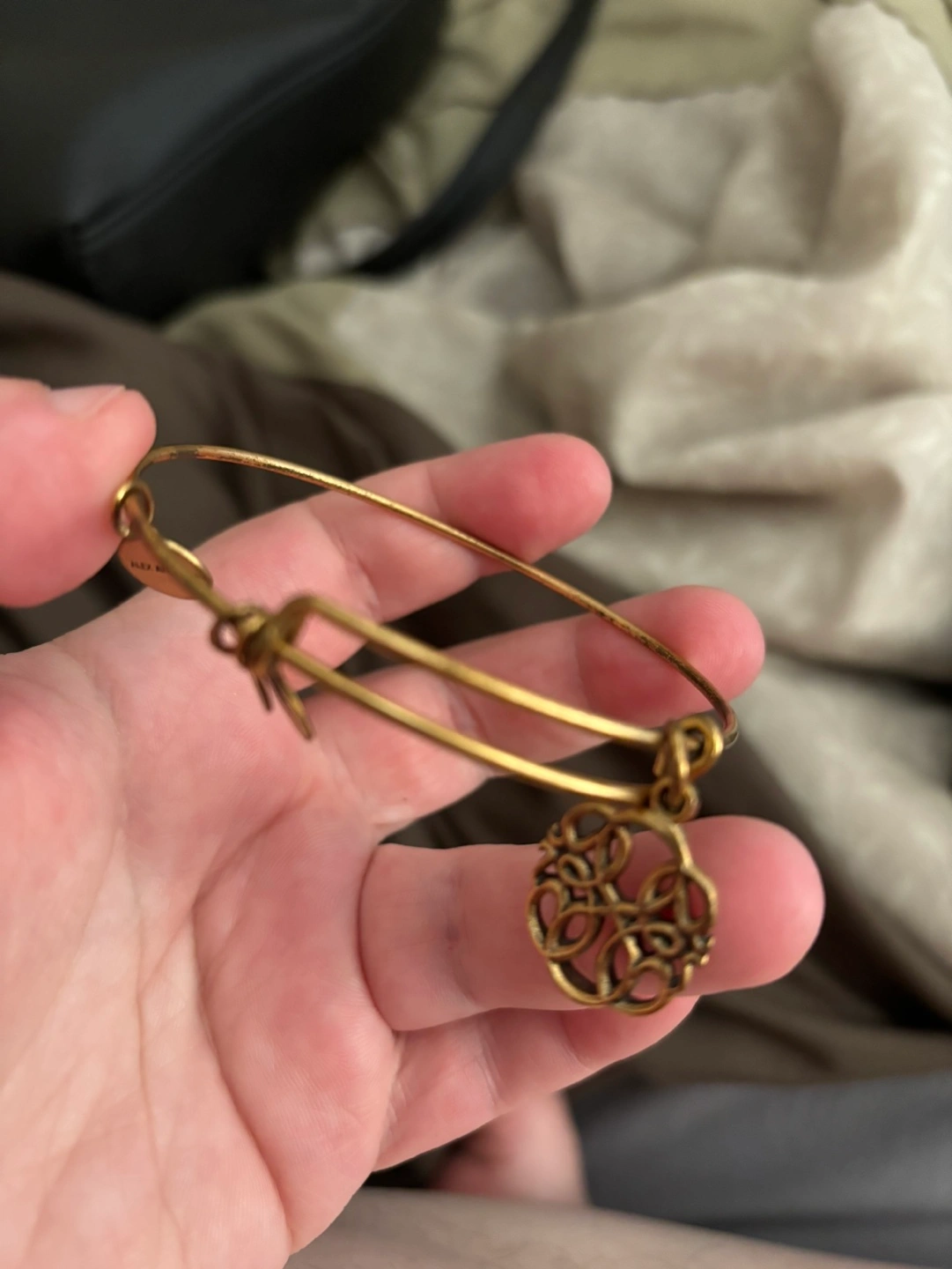 55Gold bangle bracelet with a charm. Says 'Path of Life' strength, motivation, knowledge. Just needs a cleaning