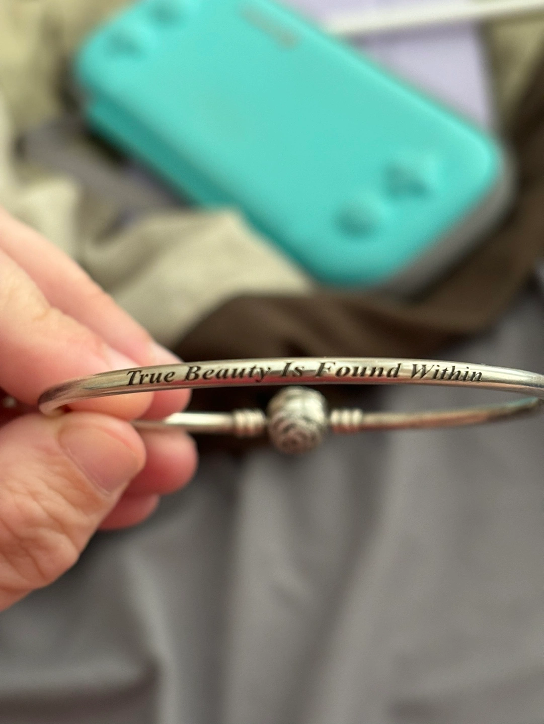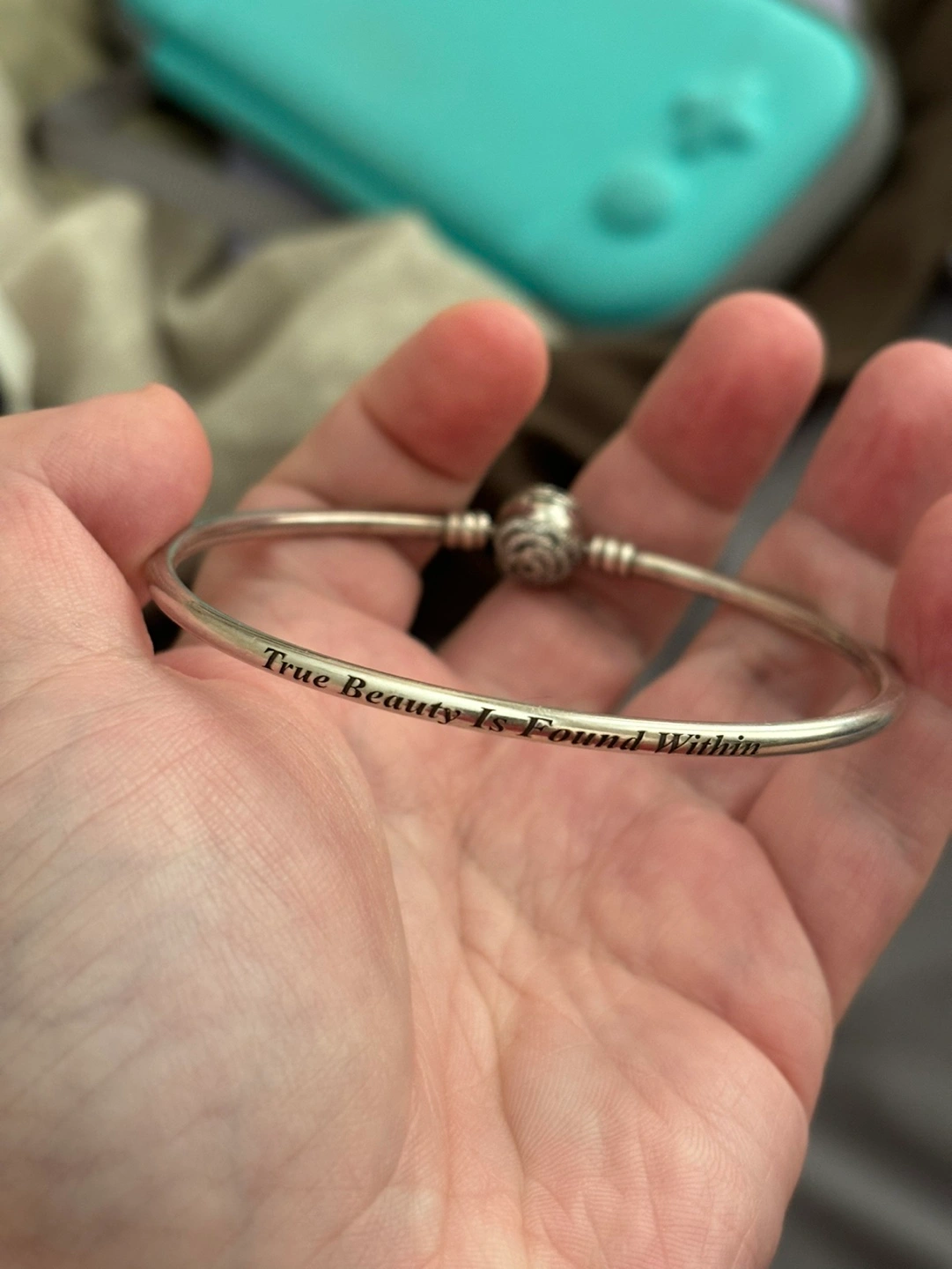 44Silver bracelet with an inscription. It has a clasp. From the beauty and the beast collection
