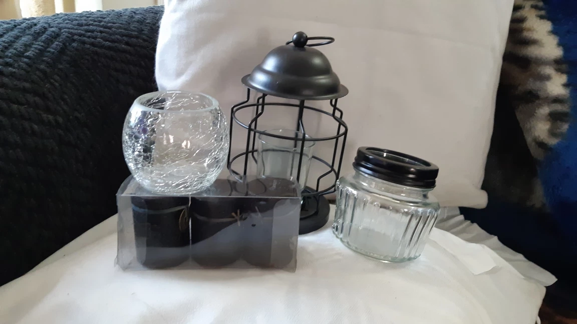 Black metal lantern with glass insert and a lid. Two glass candle holders with textured glass. Three votive candles included. Black theme