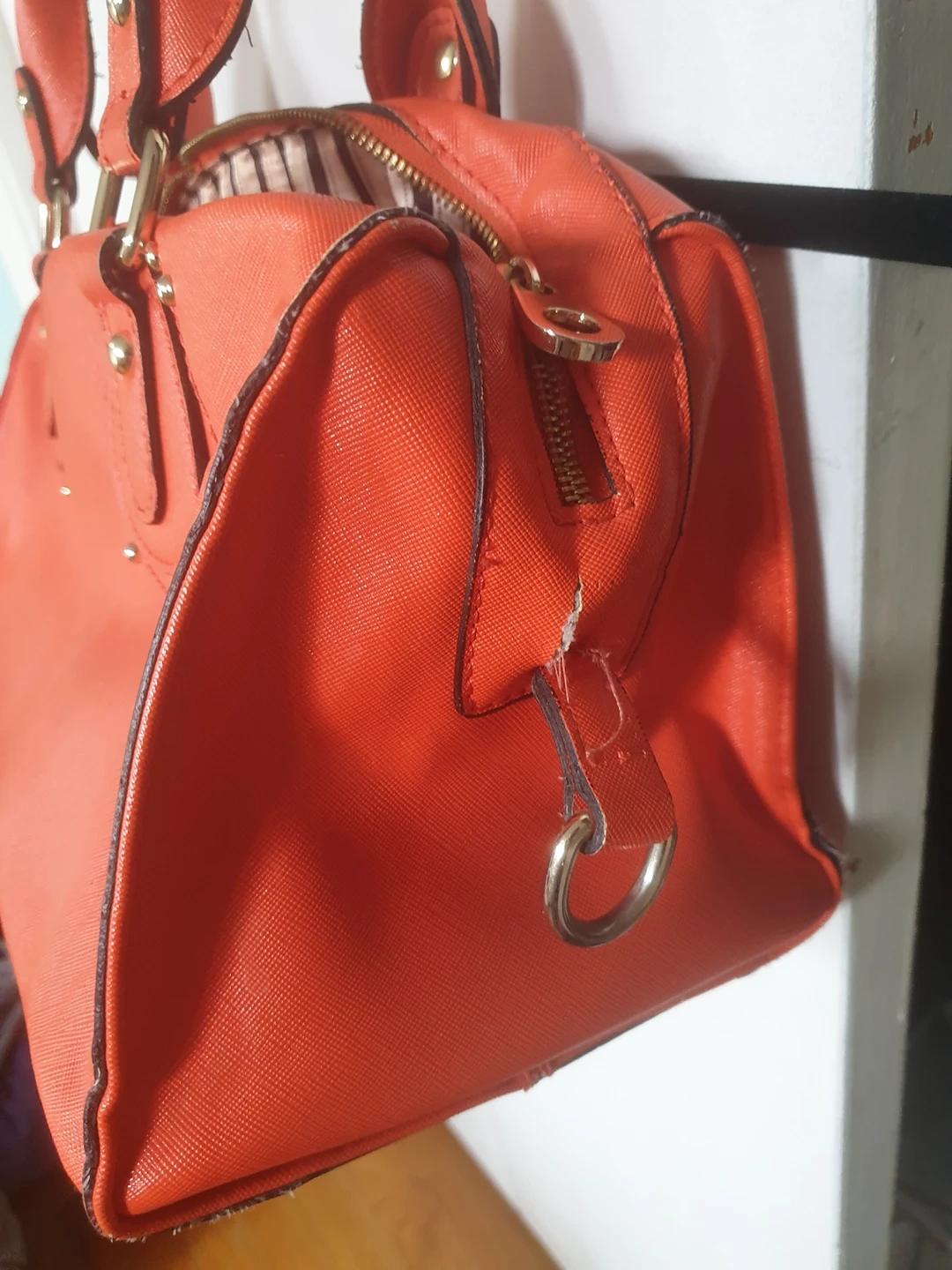 Bright orange handbag can fit a small tablet and a ton of stuff! lots of pockets, hook area slightly coming apart that can fixed, and bright color perfect fit autumn