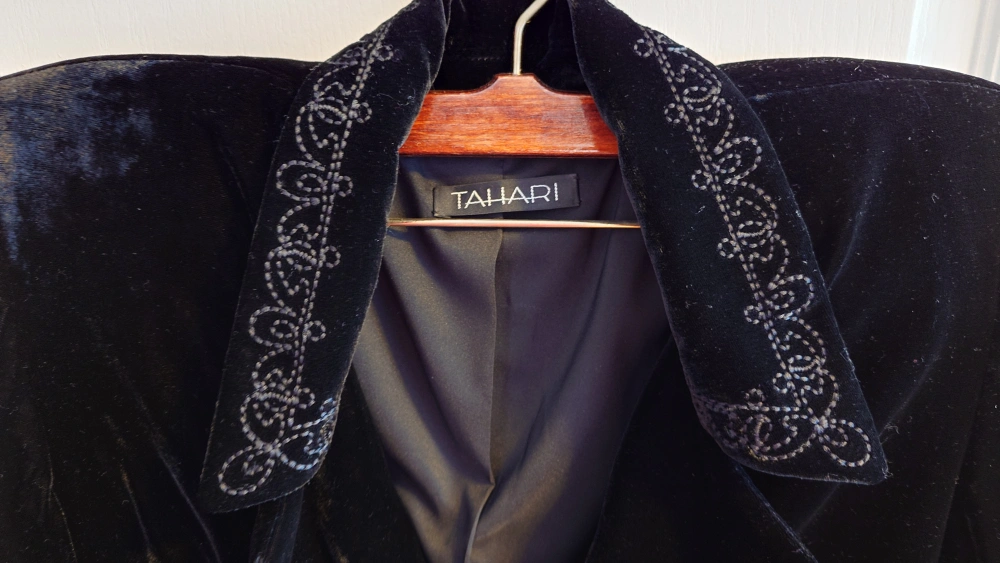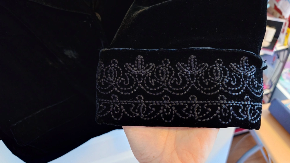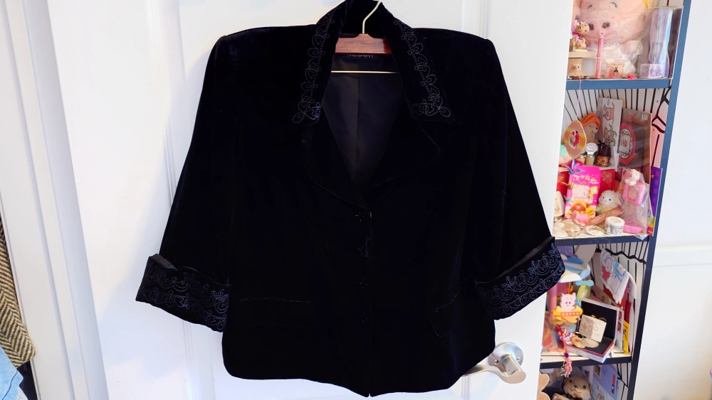 Black velvet blazer with embroidered detailing. Size 6. Button closure. Special bundle price if getting more items.