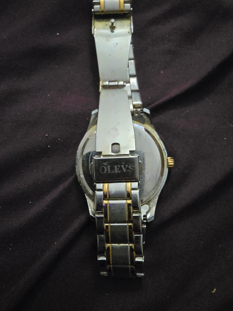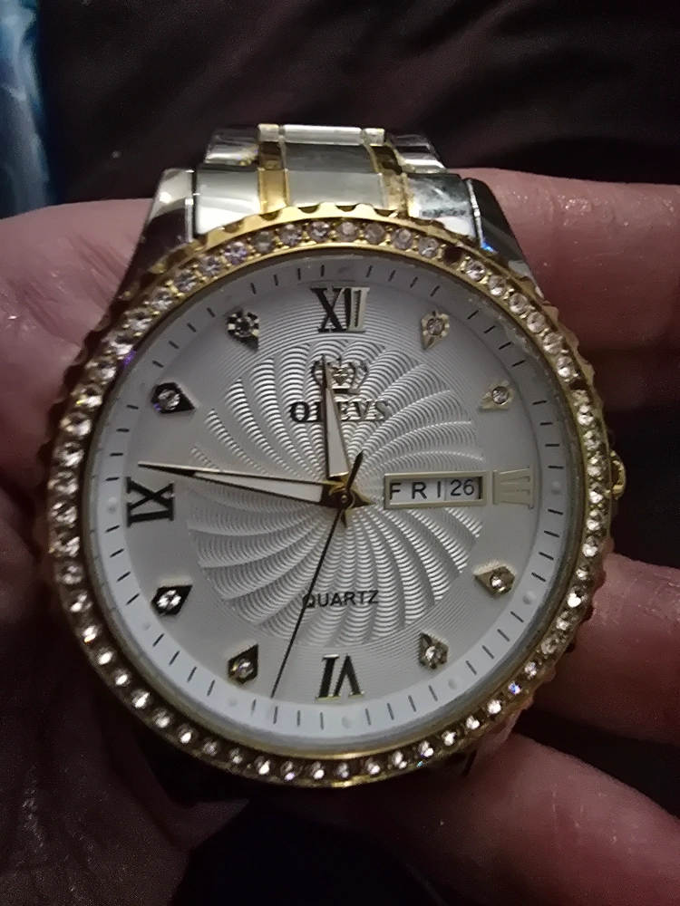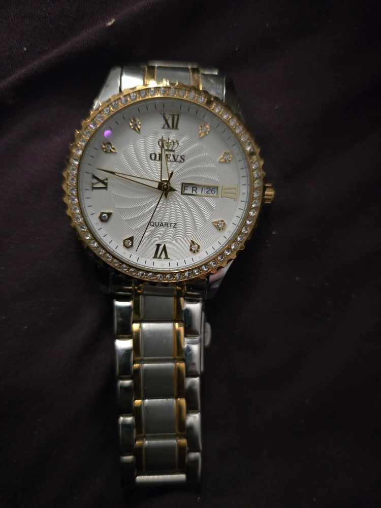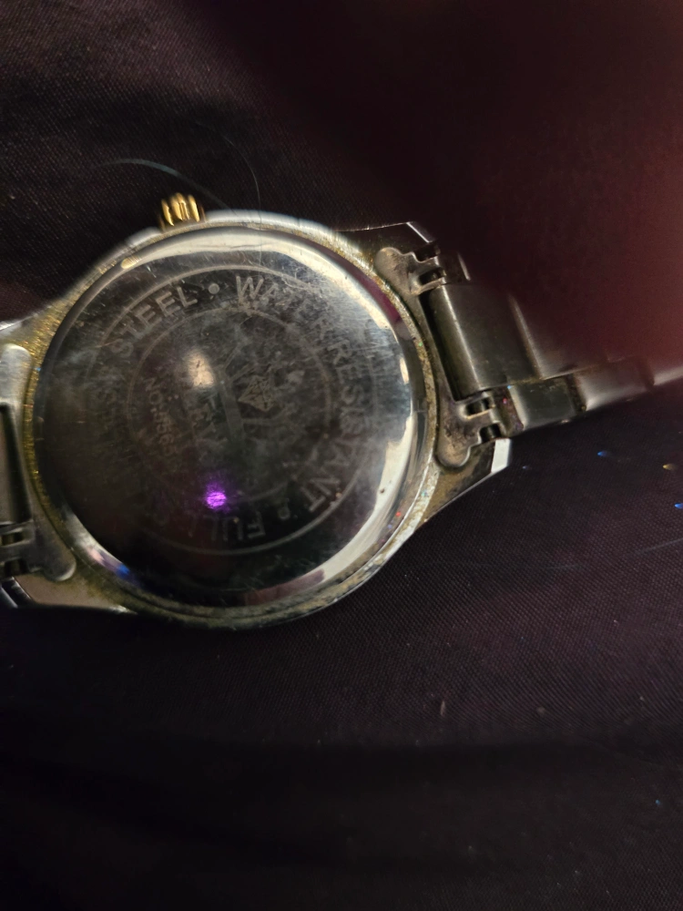 Two-tone stainless steel band. White face with Roman numerals. Date display. Quartz movement. missing a stone. working condition