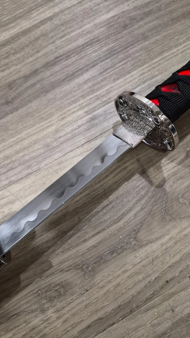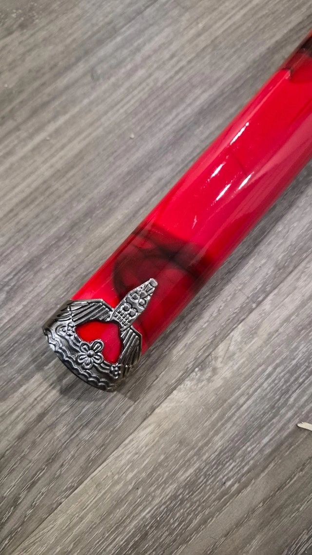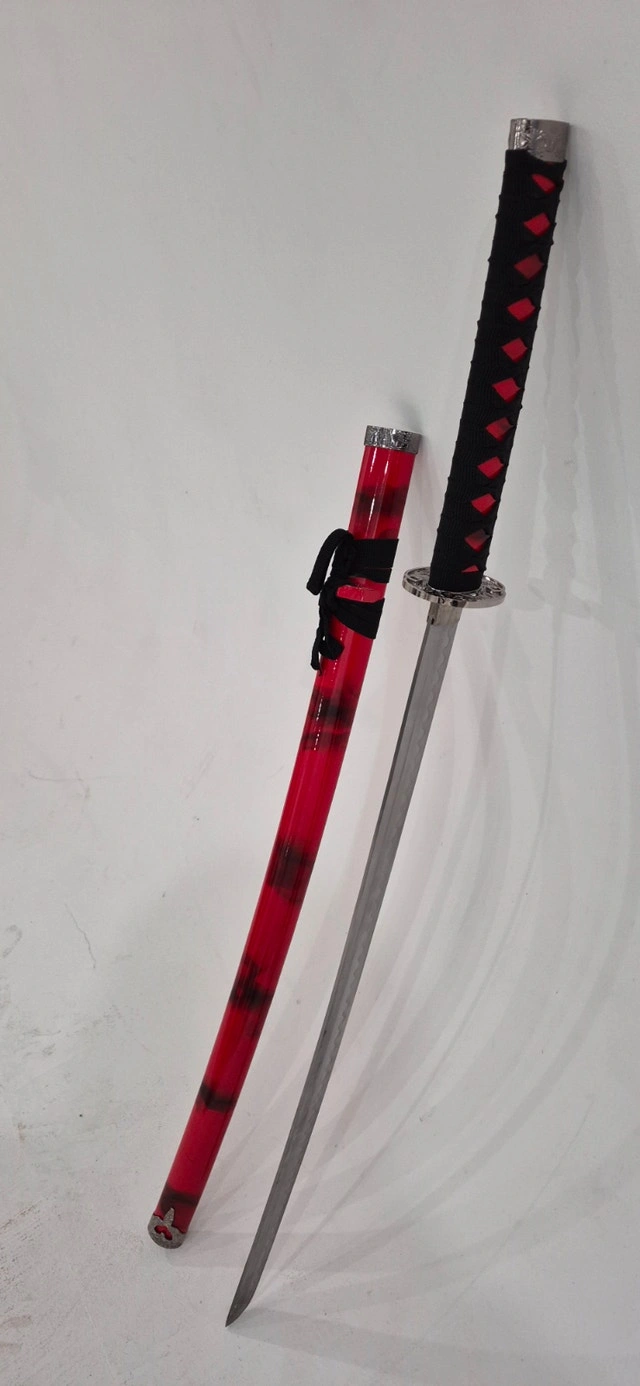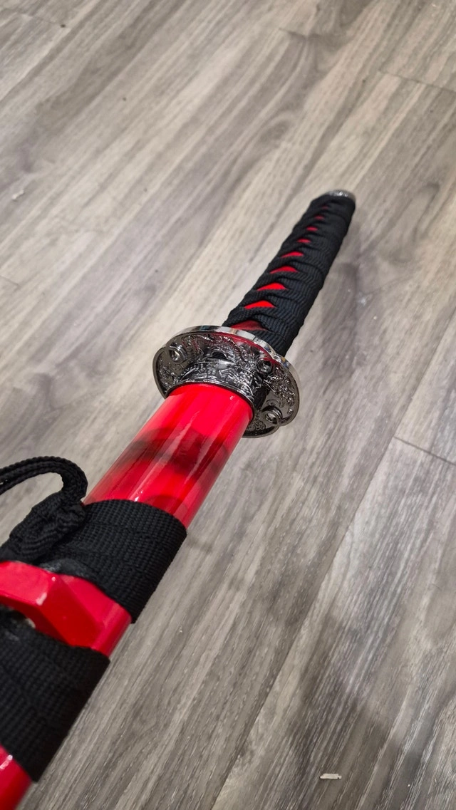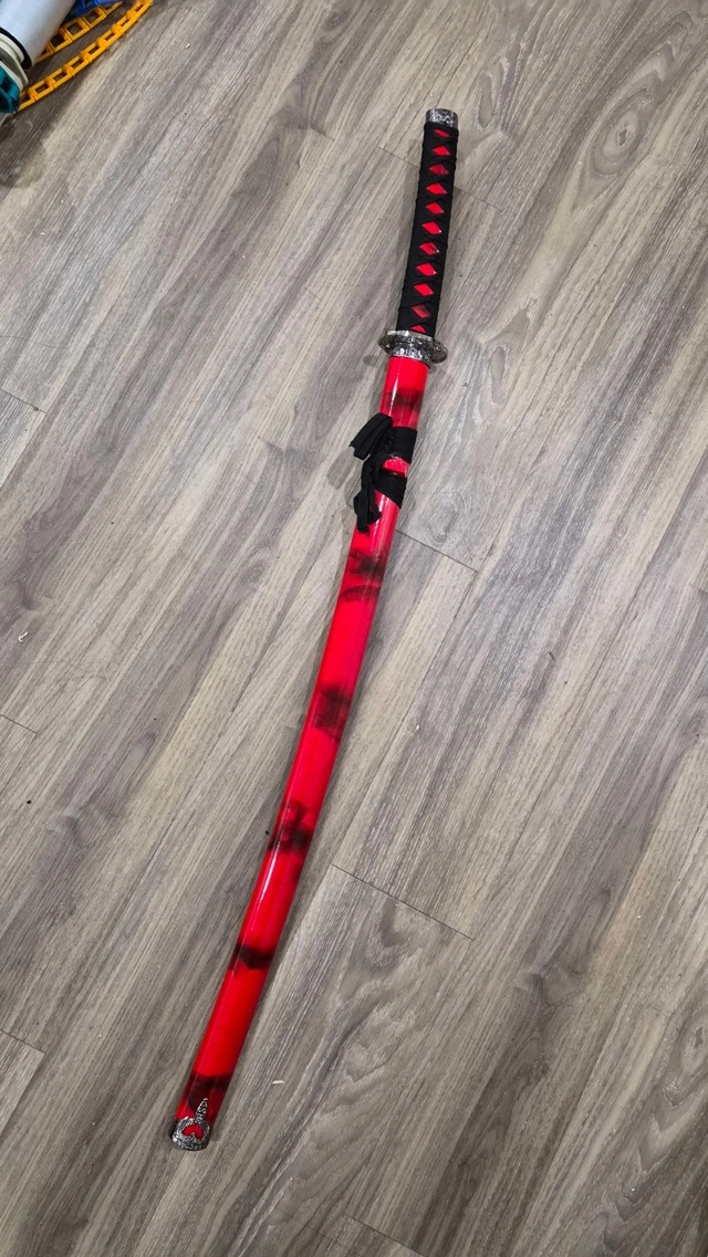 Perfect condition. Elegant Japanese-Inspired Katana with Bold Red Finish. Crafted for collectors, cosplay lovers, martial arts enthusiasts, and interior décor. The Katana feature long, curved 1045 carbon steel blades stored in beautiful hardwood scabbards with zinc alloy facets and hand-painted red marble coloring, length 40 inches.