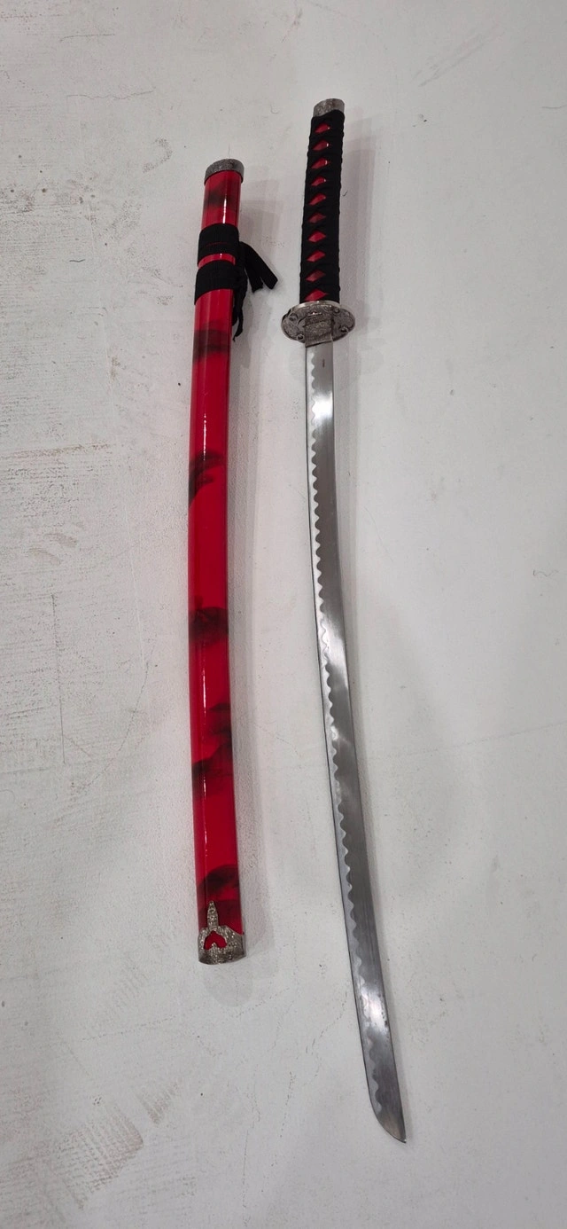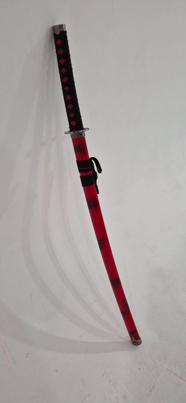 Perfect condition. Elegant Japanese-Inspired Katana with Bold Red Finish. Crafted for collectors, cosplay lovers, martial arts enthusiasts, and interior décor. The Katana feature long, curved 1045 carbon steel blades stored in beautiful hardwood scabbards with zinc alloy facets and hand-painted red marble coloring, length 40 inches.