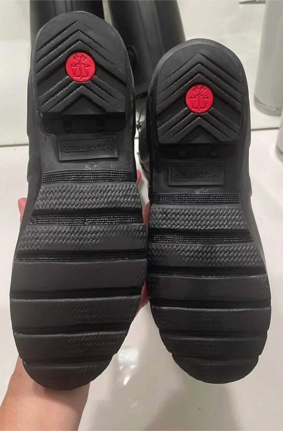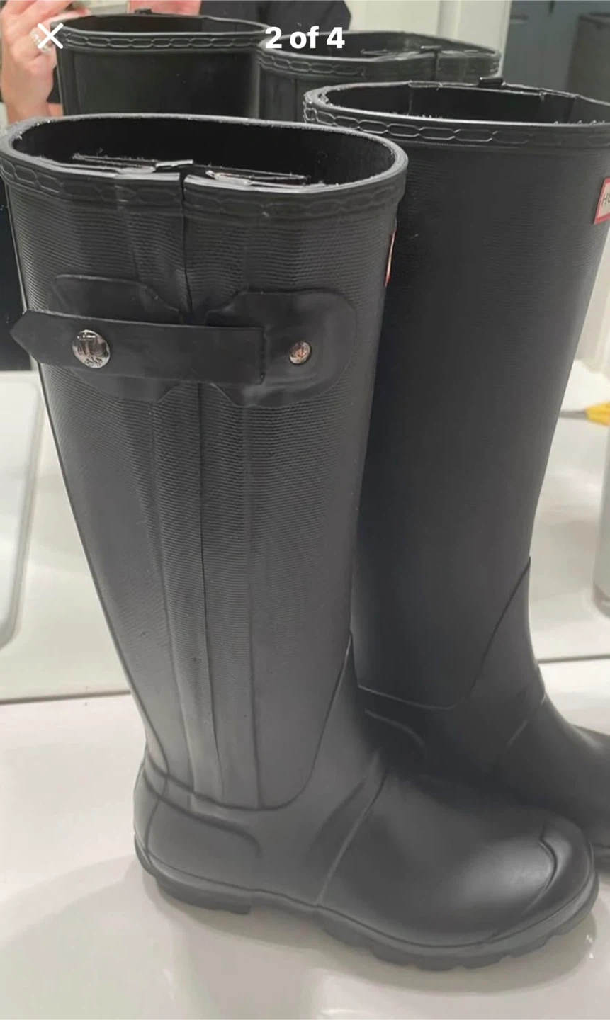 Classic black tall rubber rain boots from Hunter. These boots feature a durable rubber construction and the iconic Hunter logo. They're perfect for staying dry in wet weather, whether you're out for a walk or just running SIZE 7 women’s