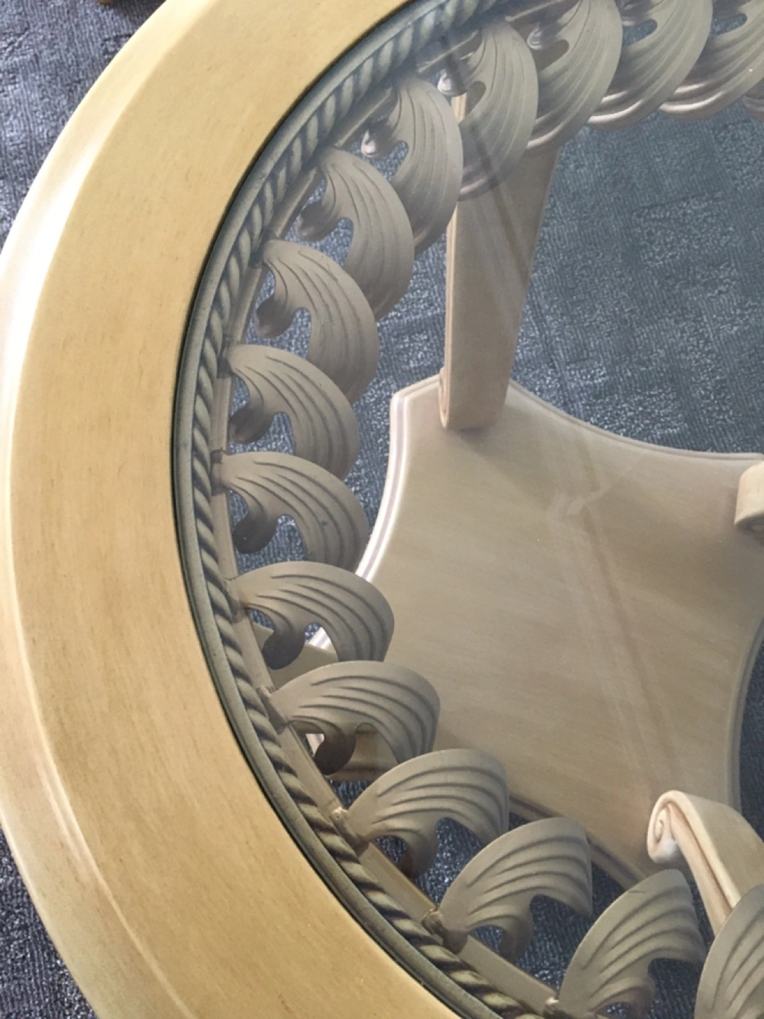 A light wood round coffee table with a decorative glass insert. It has ornate carved details on the legs and around the rim. This table's classic design adds elegance to any living space. Just like new for $249