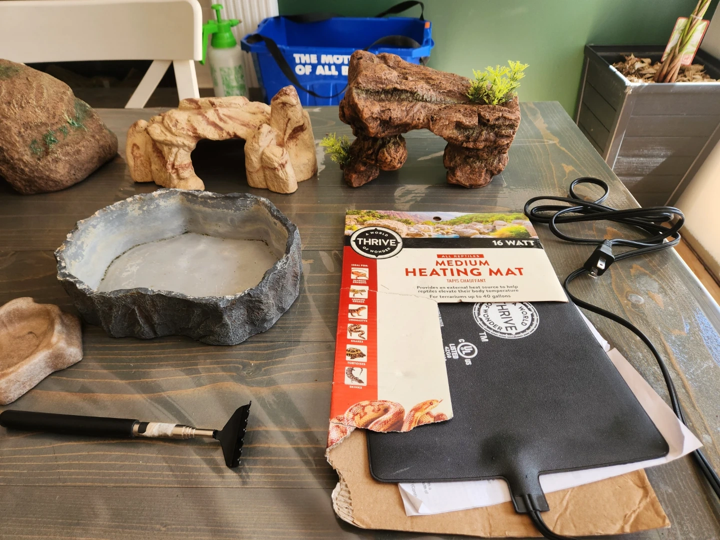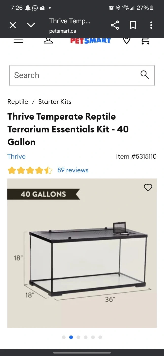This Thrive reptile starter kit includes a 40-gallon glass terrarium. It also comes with a heating mat, two hides, a food dish, and tortoise food. Perfect for setting up a new habitat!