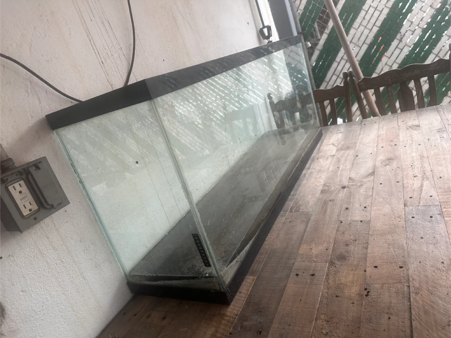 This is a large glass aquarium tank. It's made of glass with a black plastic trim.