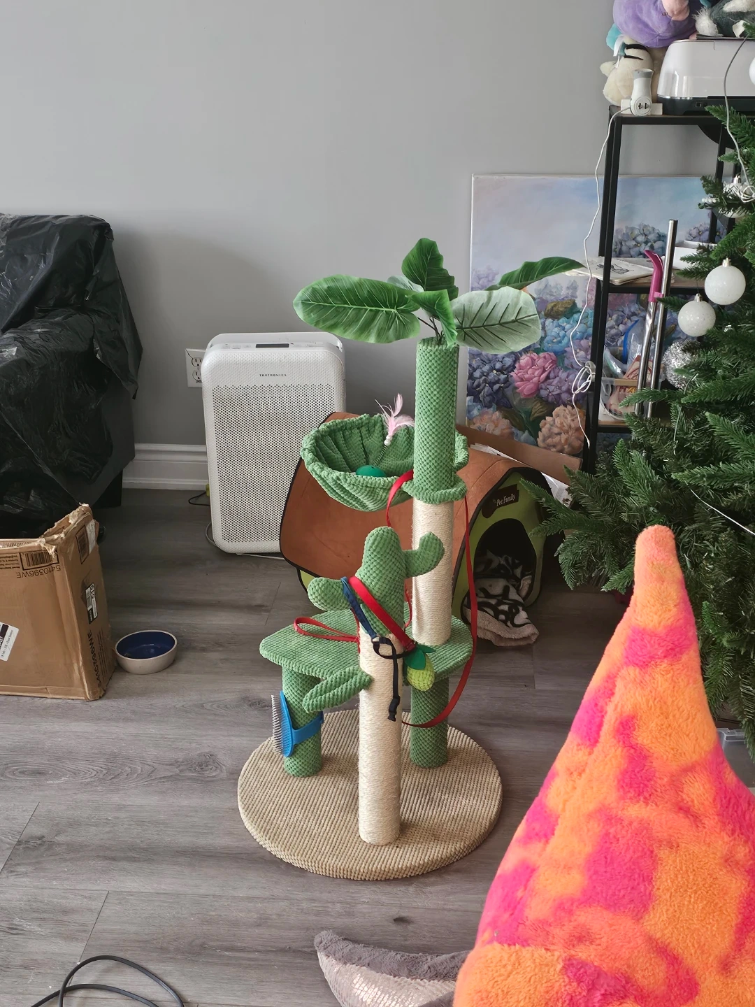 Giving away a fun cat tree! It features a cute cactus design and a leafy top. It's in great shape and ready for a new feline friend to enjoy. Its in good condition just no longer need it.