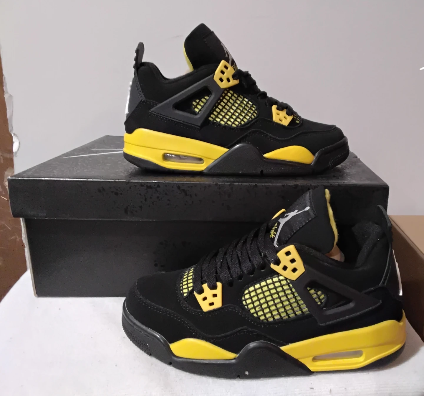 These Air Jordan 4 sneakers feature a striking black and yellow colorway, inspired by the "Thunder" release. They include the iconic Jumpman logo and a classic silhouette. This pair comes with its original box.