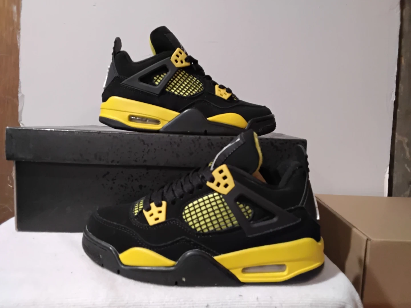 These Air Jordan 4 sneakers feature a striking black and yellow colorway, inspired by the "Thunder" release. They include the iconic Jumpman logo and a classic silhouette. This pair comes with its original box.