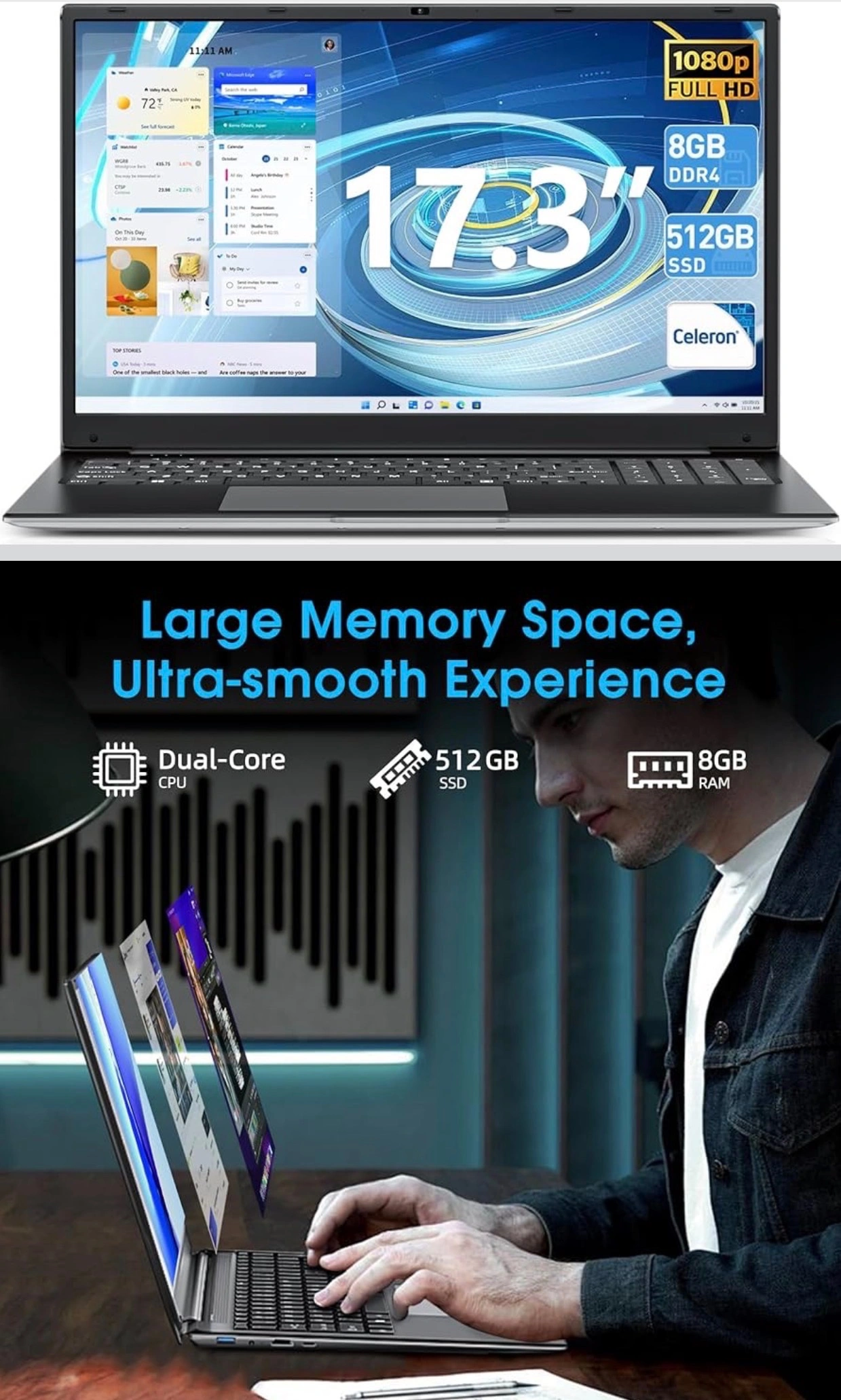 Powerful configuration: Equipped with the Celeron quad-core processor, turbo frequency up to 2.5 GHz. With a 17 inch screen laptop, the colours of the 17 inch laptop are fuller, more vibrant and simple, the details are clear and reliable and the viewing angle is wide. Create exceptional visual effects