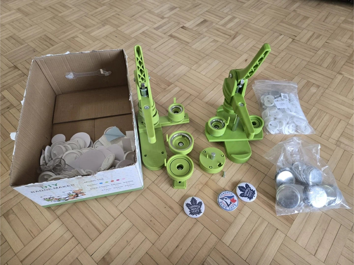 This kit includes a DIY badge maker press and a large assortment of button pin supplies. It's perfect for creating custom pins for events or personal use. The kit comes with multiple badge makers and ample pin components.