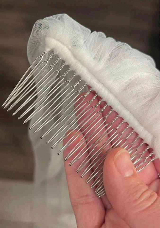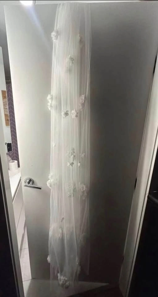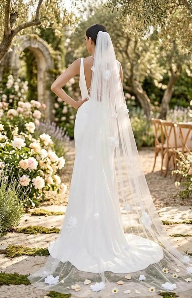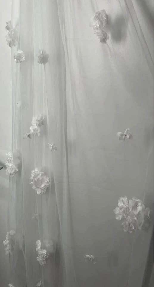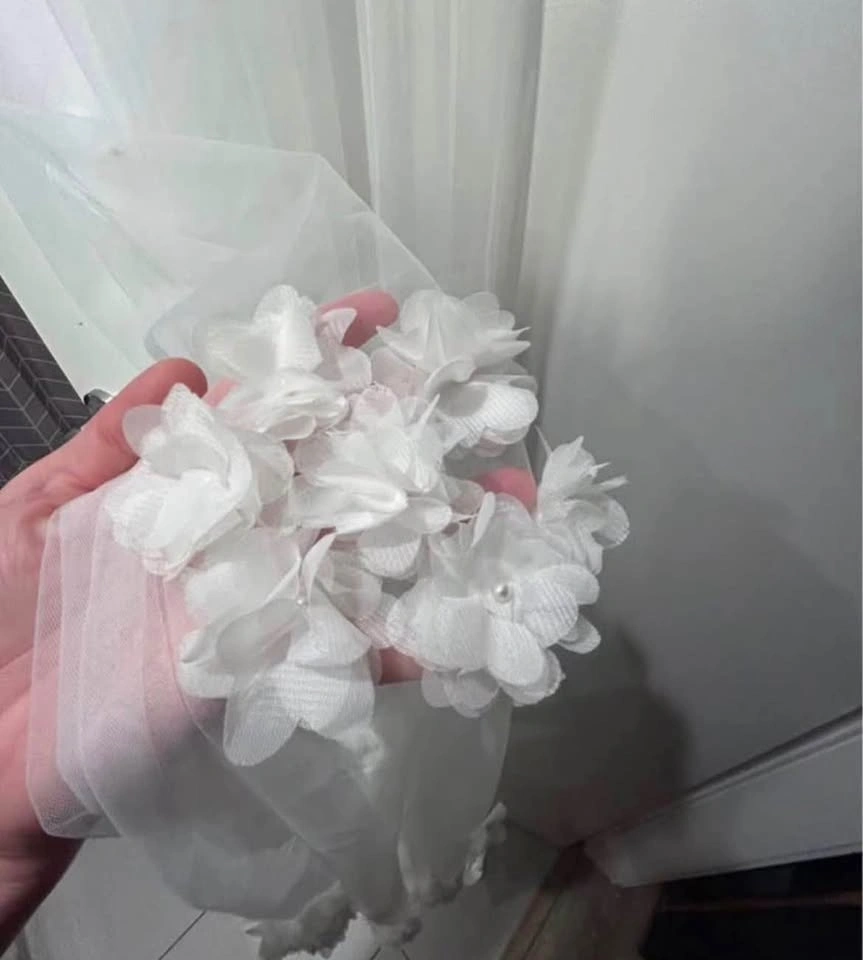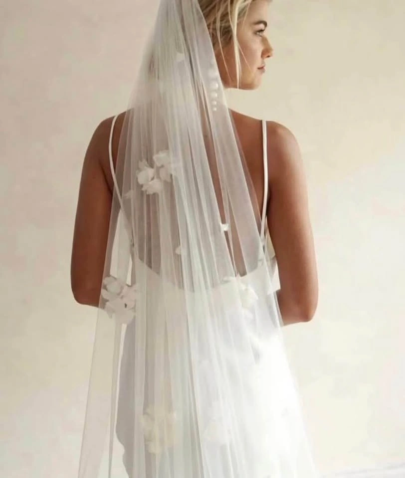New and flawless. Chiffon flowers sewn on. Extra flowers laid on dress in first photo are no part of it. Off/soft white available, 200cm with comb sewn in. Please respect pricing.