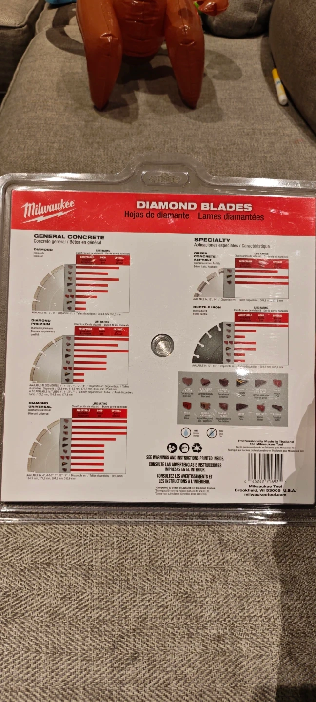 This is a Milwaukee Diamond Premium blade, 230mm in diameter. It's designed for extended life and fast cutting. Use this blade for general concrete and specialty green concrete applications.