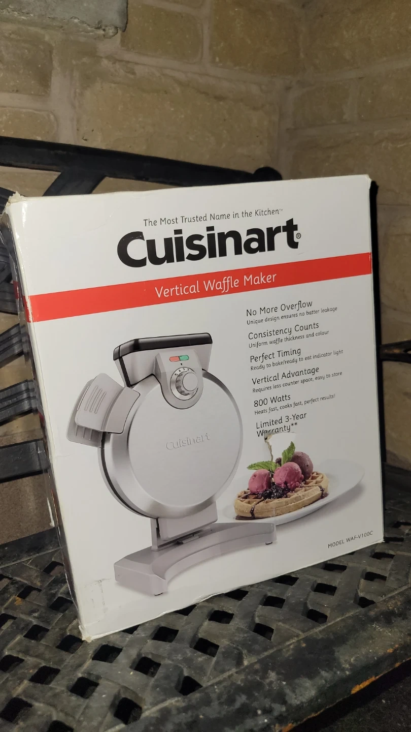 Cuisinart Vertical Waffle Maker, model WAF-V100C. This unit features an 800-watt heating element for fast cooking. It also has a unique design to prevent batter overflow and an indicator light for perfect timing.