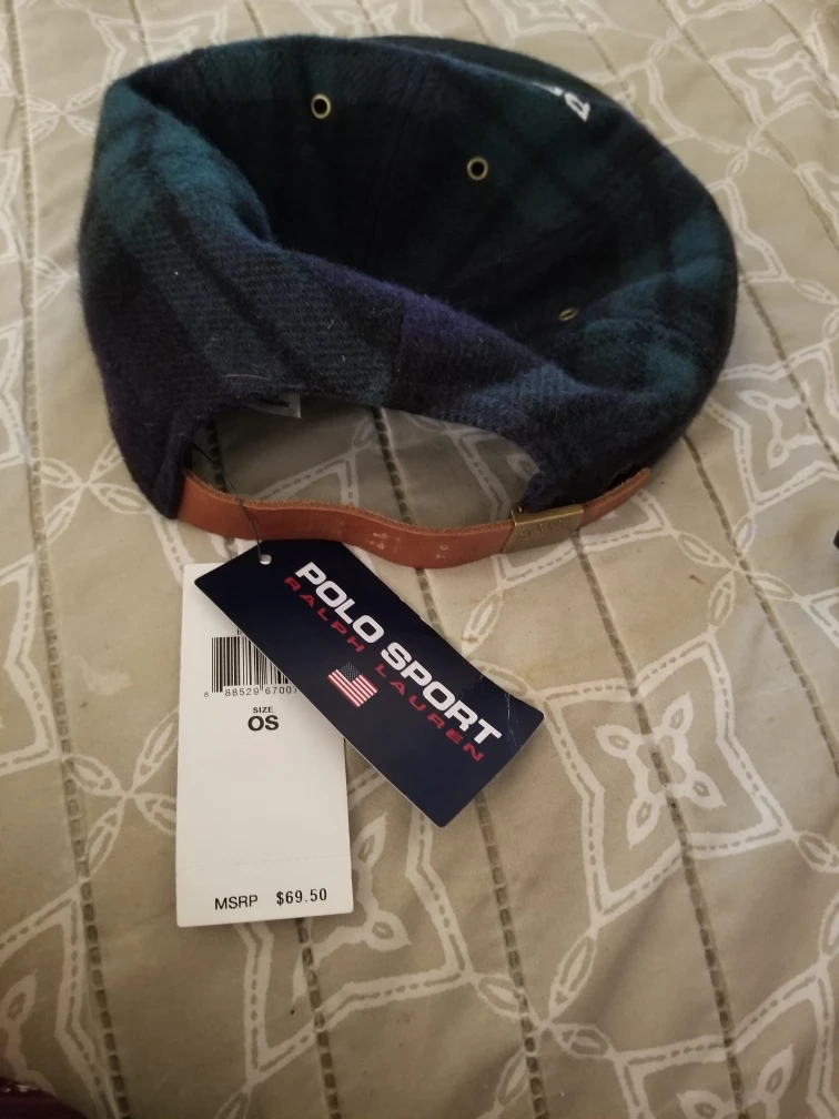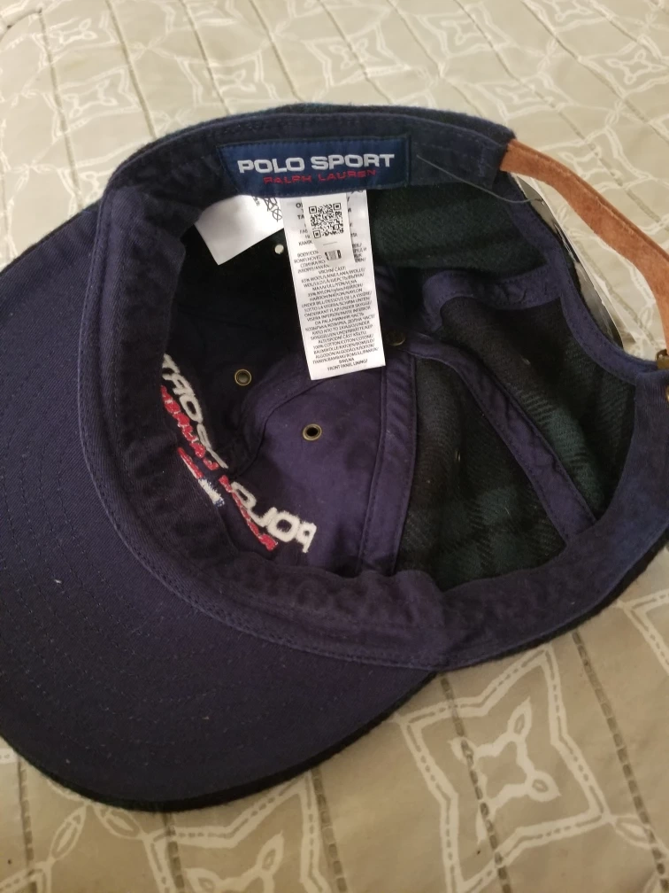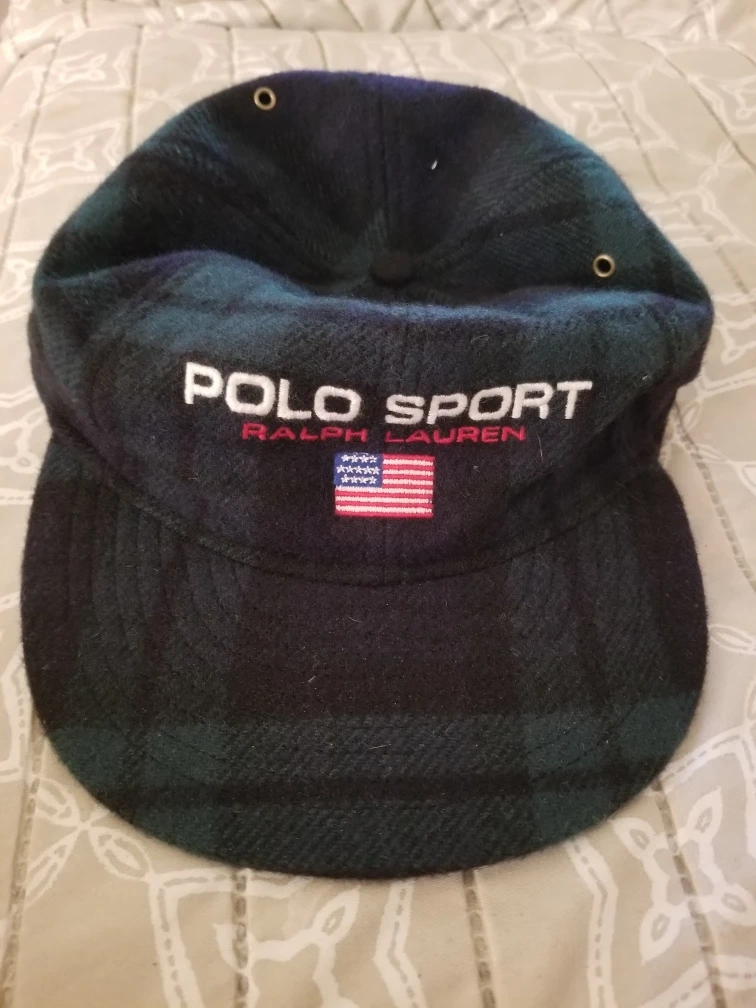 A plaid baseball cap. Features a Polo Sport logo. The cap has a brown leather strap. You can wear this hat on a long walk to clear your head.