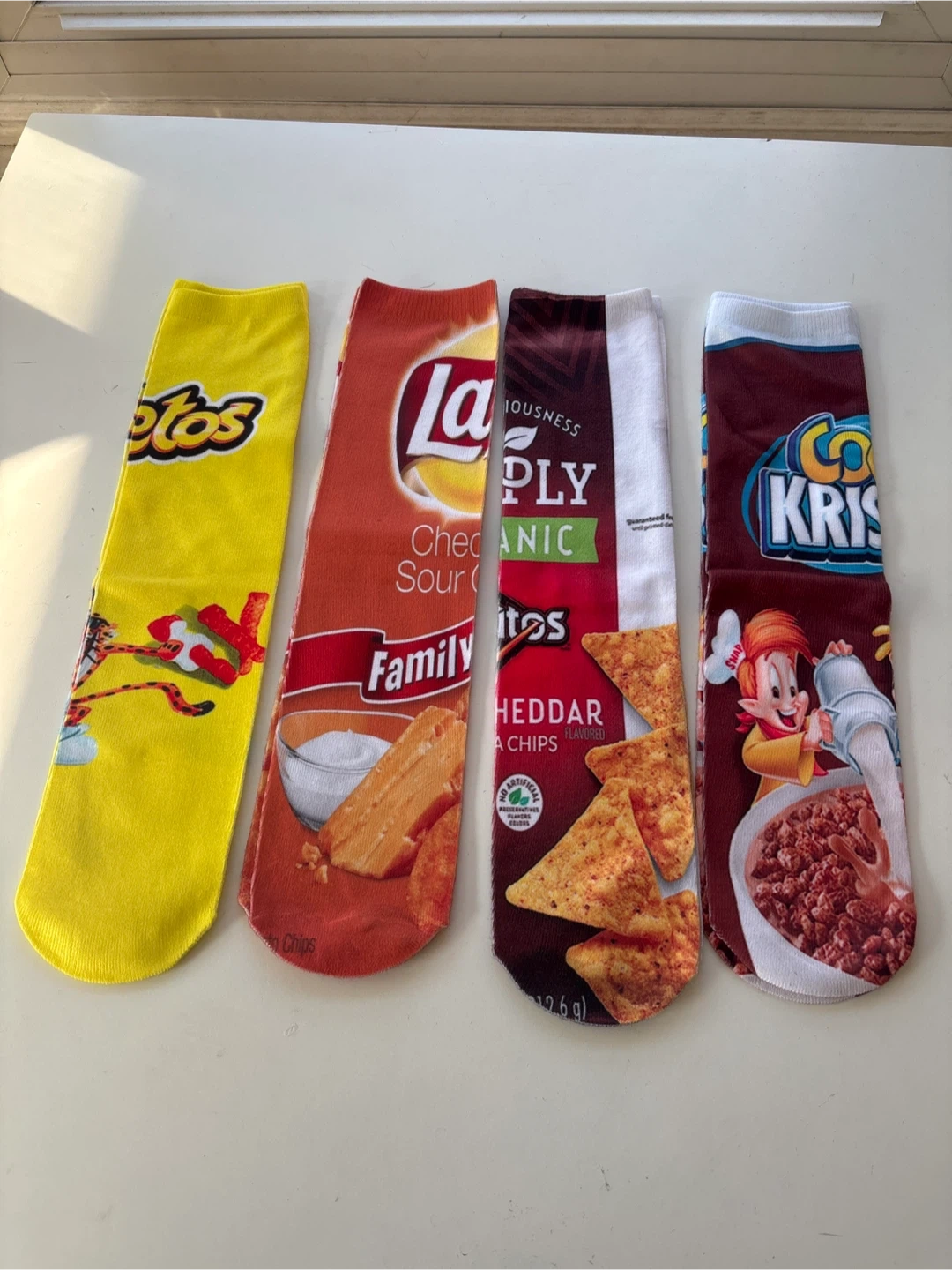 Four pairs of novelty socks featuring popular snack brands. Includes designs inspired by Lay's Sour Cream & Onion chips, Doritos Nacho Cheese chips, and General Mills Lucky Charms cereal. They're a fun way to show off your favourite munchies!
