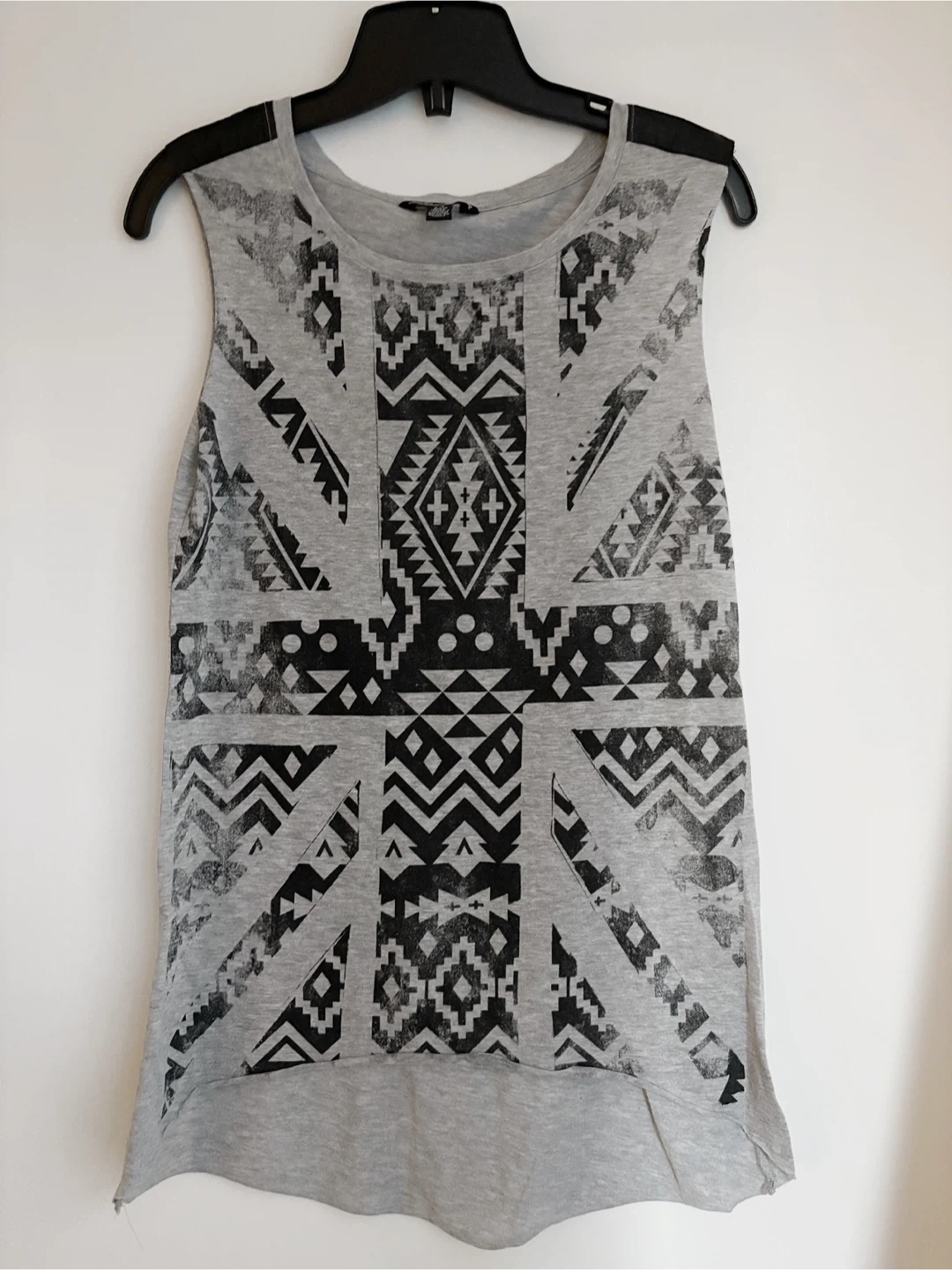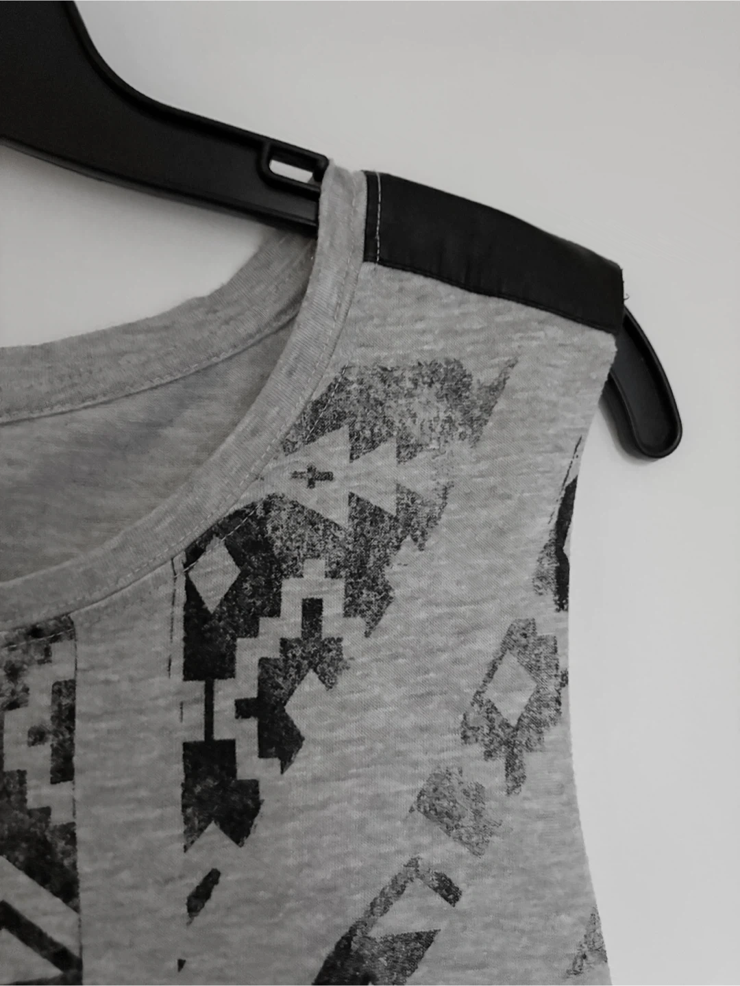 Selling a grey tank top with a black geometric pattern. It has a longer back and a shorter front with pleather shoulder detailing.