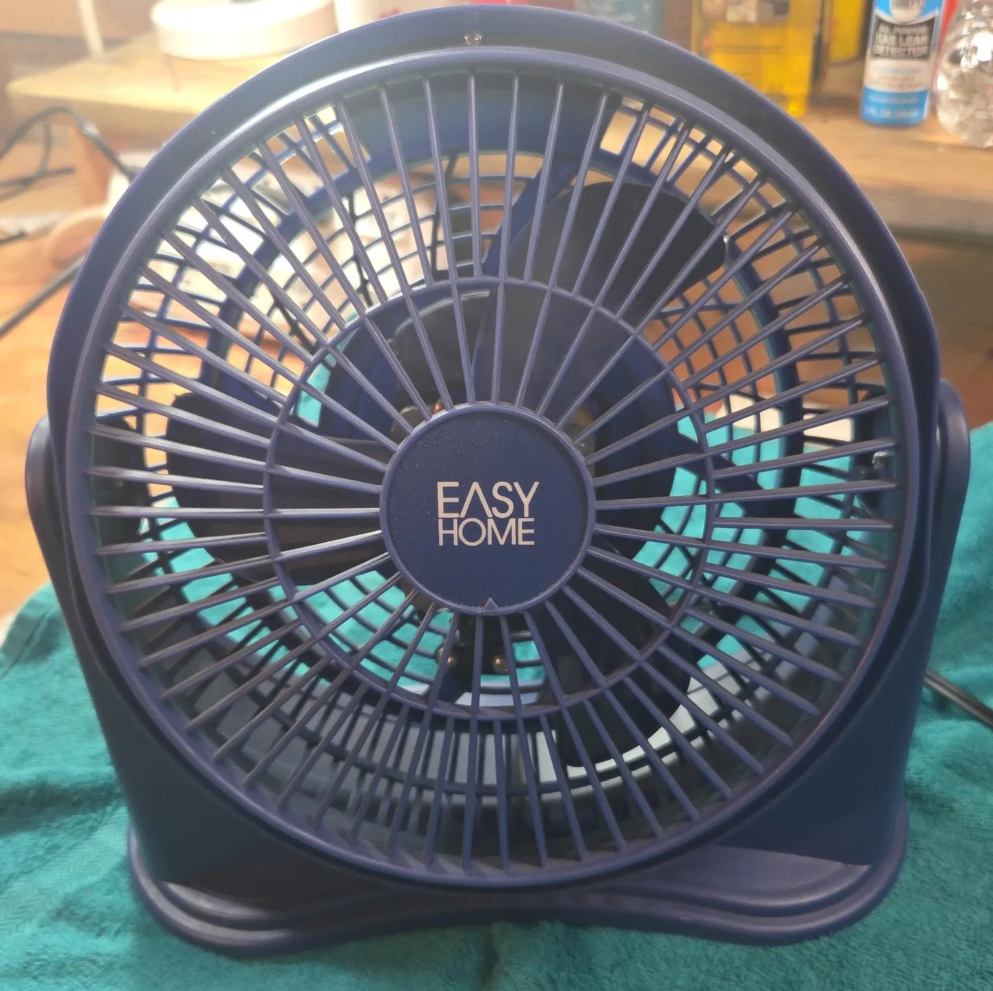 This is an Easy Home brand blue box fan. It's a compact size for personal use. It's great for circulating air in small spaces!